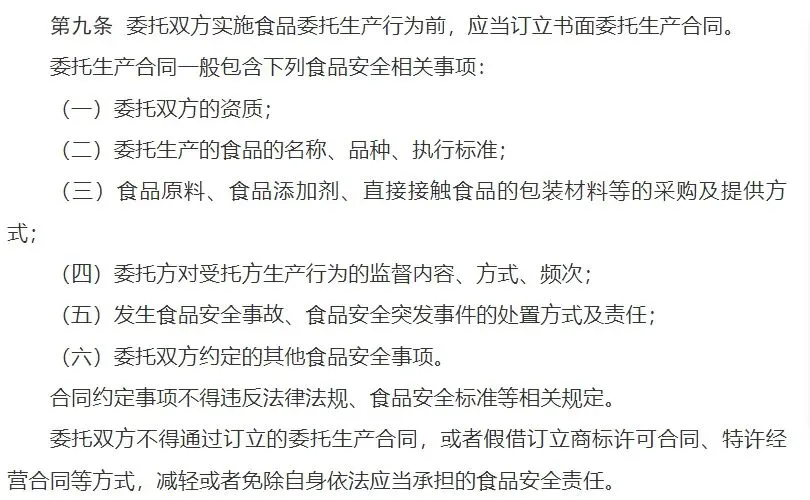 如第十三条规定明确要求,委托生产的预包装食品,须在标签紧邻位置标注委托方+受托方的名称、地址、联系方式,并冠以明确字样。