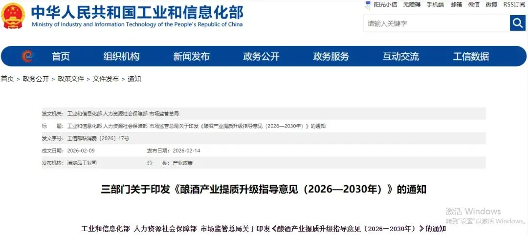 2月14日,工信部、人社部、国家市监总局联合印发《酿酒产业提质升级指导意见(2026-2030年)》,为行业划定五年发展蓝图,明确两大关键节点目标,被视作酿酒产业升格为“历史经典产业”后的又一国家级利好。