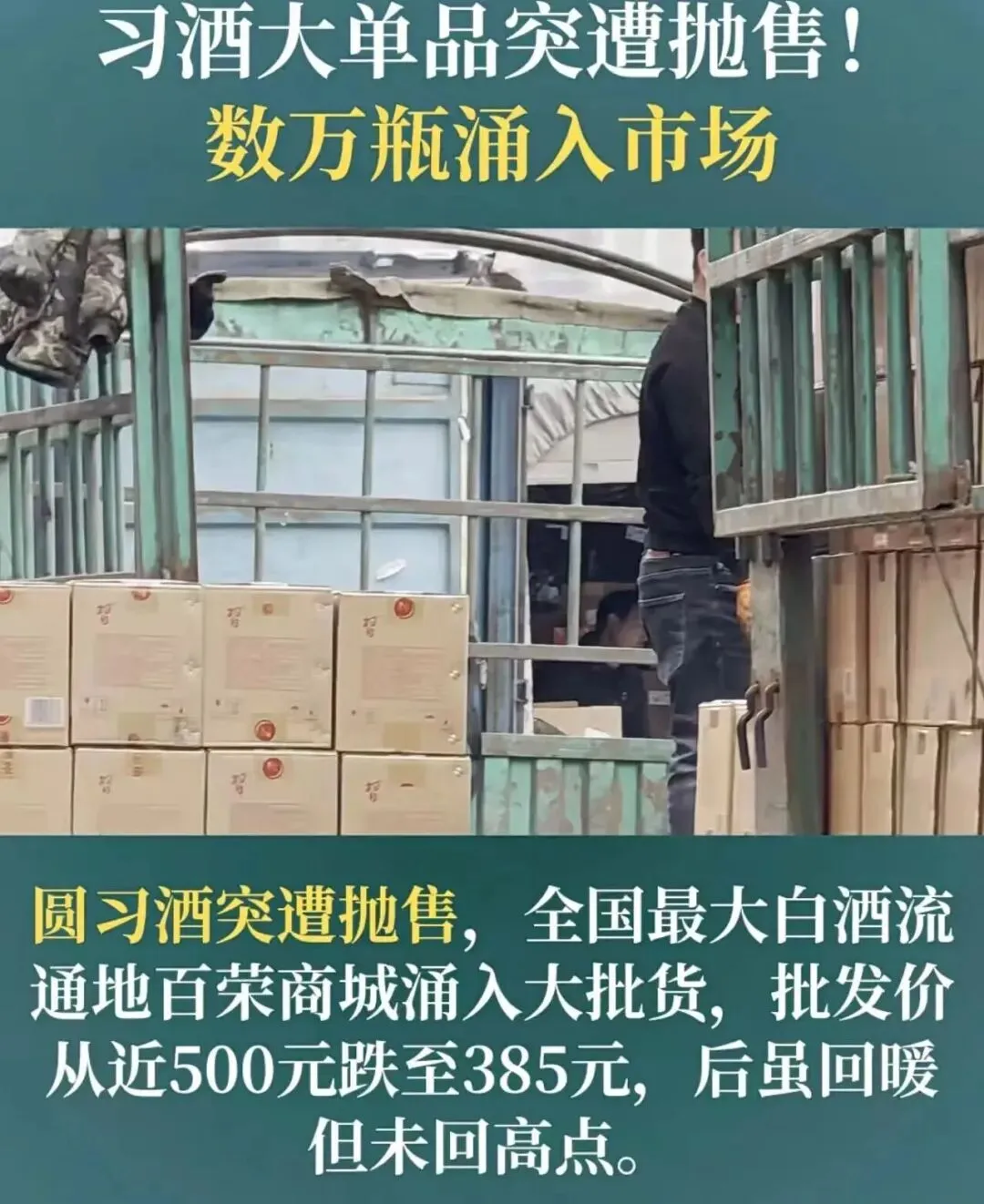 1月20日,市场传出消息,君品习酒2026年限量4000吨,主动“紧急刹车”控量;2月初,百元酱香单品圆习酒在百荣市场价格“跳水”,据说当时是从500元跌至385元,后有抬升,但仍在低位徘徊。