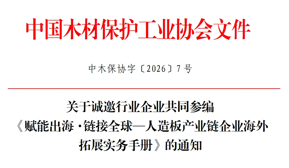 本手册立足协会视角,整合行业权威数据、政策解读、企业资源及海外市场分析,兼顾实用性与权威性,本手册将作为行业权威工具书、对外交流名片、国际商务对接资料,面向海外采购商、经销商、行业协会及国内出海企业发行使用。既是国内企业出海的“导航图”,也是国外合作伙伴对接中国优质资源的“工具书”,助力中外人造板行业互联互通、共赢发展。为确保书籍内容全面、权威、具有代表性,现面向全国人造板产业链相关企业公开征集参编单位。现将有关事项通知如下:
