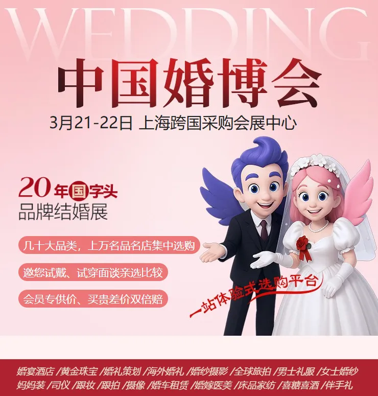 2026年上海婚博会时间:3月21日-3月22日,上海婚博会地址:上海跨国采购会展中心。全球超大规模婚博会、世界性品牌结婚展;囊括婚纱摄影、婚纱礼服、婚庆公司、婚宴、结婚钻戒、婚庆用品、婚房装修、婚车、新娘美容等核心结婚消费行业一线知名品牌企业