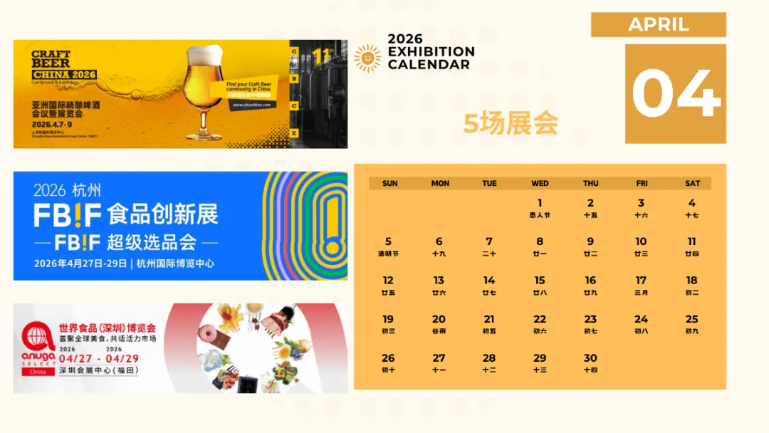 春意渐浓,食品行业的“春季展会窗口期”即将开启。3、4月历来是产业链交流与年度布局的关键节点,多场重量级展览集中登场。从食材原产地到冷链终端,从酒水饮品到多元餐饮,几乎覆盖整个食饮产业版图。