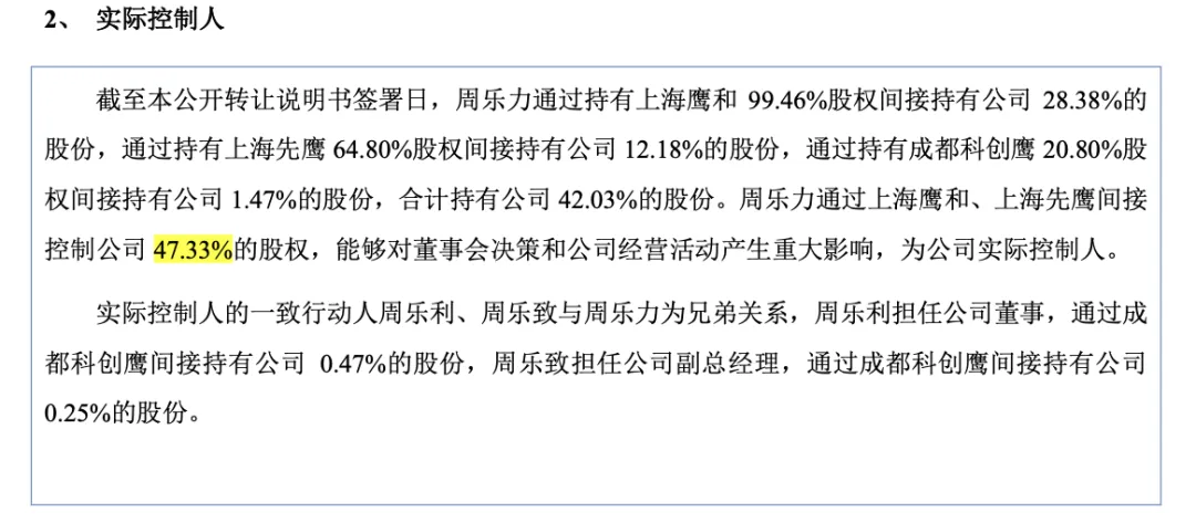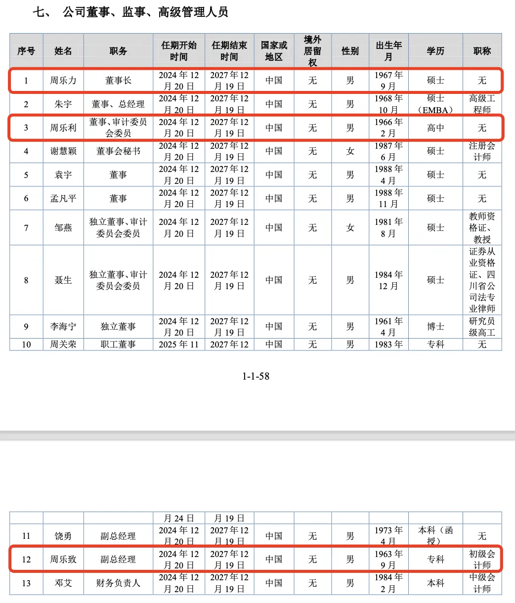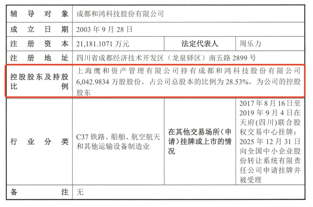近日,成都和鸿科技股份有限公司(以下简称“和鸿科技”)启动IPO。本次IPO的辅导机构为长江证券承销保荐有限公司,律师事务所为上海市锦天城律师事务所,会计师事务所为信永中和会计师事务所(特殊普通合伙)。和鸿科技是主要从事航空发动机、燃气轮机的涡轮叶片等核心零部件的工艺研发、精密加工、特种工艺处理业务的国家级专精特新“小巨人”企业,已经发展成为国内航空发动机零部件精密加工和特种工艺处理技术的企业。业绩方面,2023年-2024年及2025上半年,和鸿科技实现营收分别为3.76亿元、3.25亿元、1.75亿元;归母净利润分别为8126.99万元、1617.08万元、2557.31万元。IPO前,上海鹰和持有公司6,042.9834万股股份,占公司总股本的比例为28.53%,为公司的控股股东。而周乐力通过持有上海鹰和99.46%股权间接持有公司28.38%的股份,通过持有上海先鹰64.80%股权间接持有公司12.18%的股份,通过持有成都科创鹰20.80%股权间接持有公司1.47%的股份,合计持有公司42.03%的股份。周乐力通过上海鹰和、上海先鹰间接控制公司47.33%的股权,能够对董事会决策和公司经营活动产生重大影响,为公司实际控制人。 实际控制人的一致行动人周乐利、周乐致与周乐力为兄弟关系,周乐利担任公司董事,通过成都科创鹰间接持有公司0.47%的股份,周乐致担任公司副总经理,通过成都科创鹰间接持有公司 0.25%的股份。谢慧颖,女,1987年6月出生,硕士学历,2011年7月至2013年4月,任成都小企业融资担保有限责任公司项目经理;2013年5月至2019年7月,任招商证券股份有限公司高级经理;2019年11月至2021年11月,任成都和鸿科技有限公司(公司曾用名)董事会秘书兼财务部长;2021年12月至2025年11月,任公司董事;2021年12月至今,任董事会秘书。