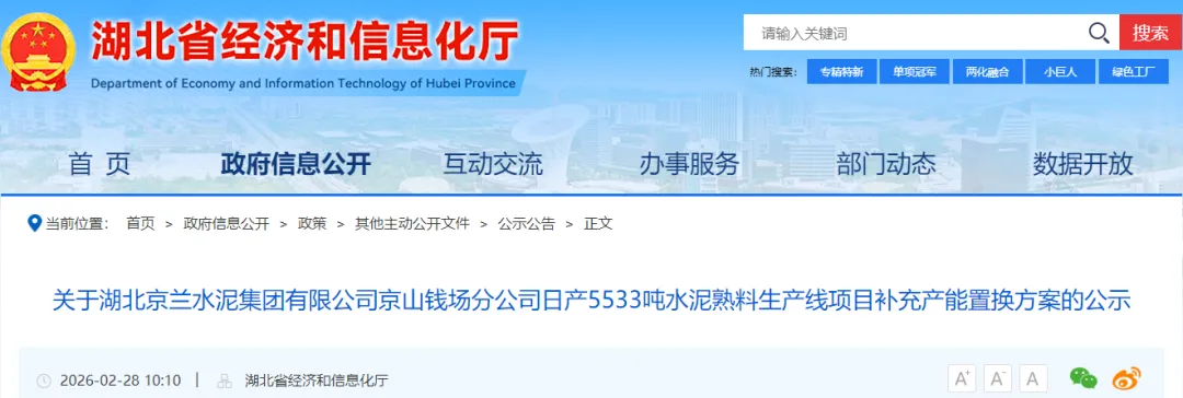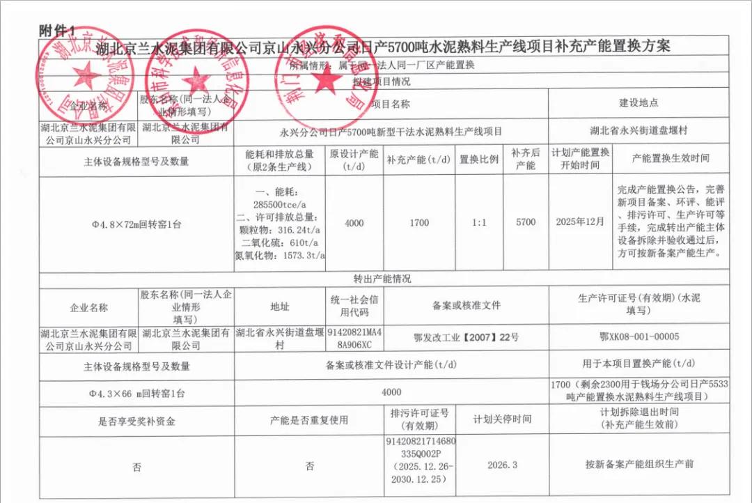 湖北京兰水泥集团有限公司京山永兴分公司一条熟料生产线补充产能
