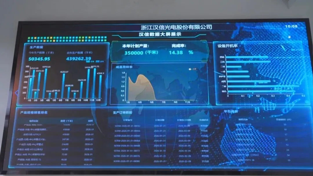 生产车间里,机器轰鸣不停,着色、套塑、成缆各道工序高效衔接,一卷卷成品光缆不断下线。车间智慧大屏上实时显示生产进度、设备运行效率等,数字化生产场景清晰呈现。