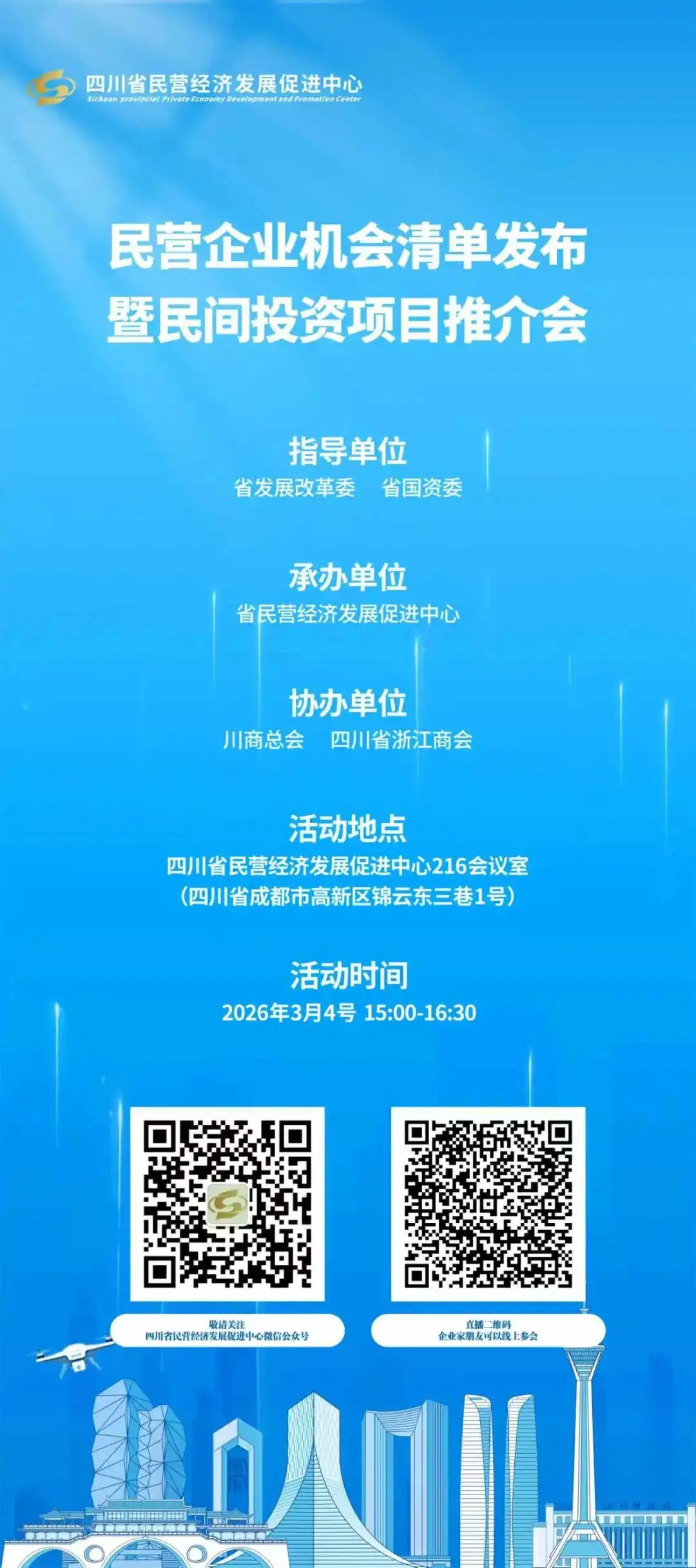 为深入贯彻落实党中央、国务院促进民营经济发展壮大决策部署,搭建高效透明的对接平台,畅通沟通交流渠道,精准释放项目机遇,进一步拓宽民间投资领域,激发企业投资活力,省发展改革委、省国资委将于3月4日下午15:00在省民营经济发展促进中心216会议室联合举办民营企业机会清单发布暨民间投资项目推介会。欢迎广大民营企业家朋友扫码预约线上参会!