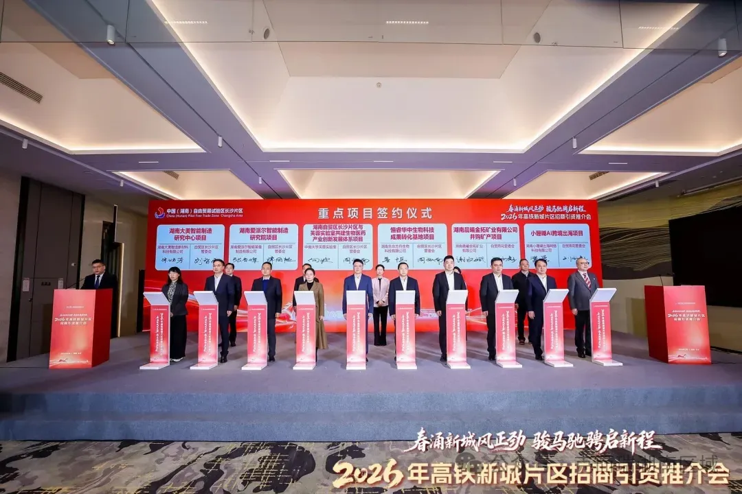 活动现场有6个项目签约,涵盖生物医药、对非经贸、智能制造、人工智能等前沿领域:芙蓉实验室与片区携手共建生物医药产业创新发展体系,围绕产业专业审查体系搭建、成果转化优先通道共享、产业创新联合发展、人才协同培育等环节深度合作,打造“科研+临床+产业+制度”四位一体的生物医药产业创新发展体系;恒睿生物聚焦创新药物研发,打造科技成果转化基地;爱派尔与大美智造分别建设智能制造研究院和研究中心,赋能产业升级;晨曦金拓专注于海外矿产资源的战略性投资与矿山开发全产业链运营;小珊瑚以AI技术助力品牌扬帆出海。这些项目的落地,将为高铁新城片区高质量发展注入强劲动能。