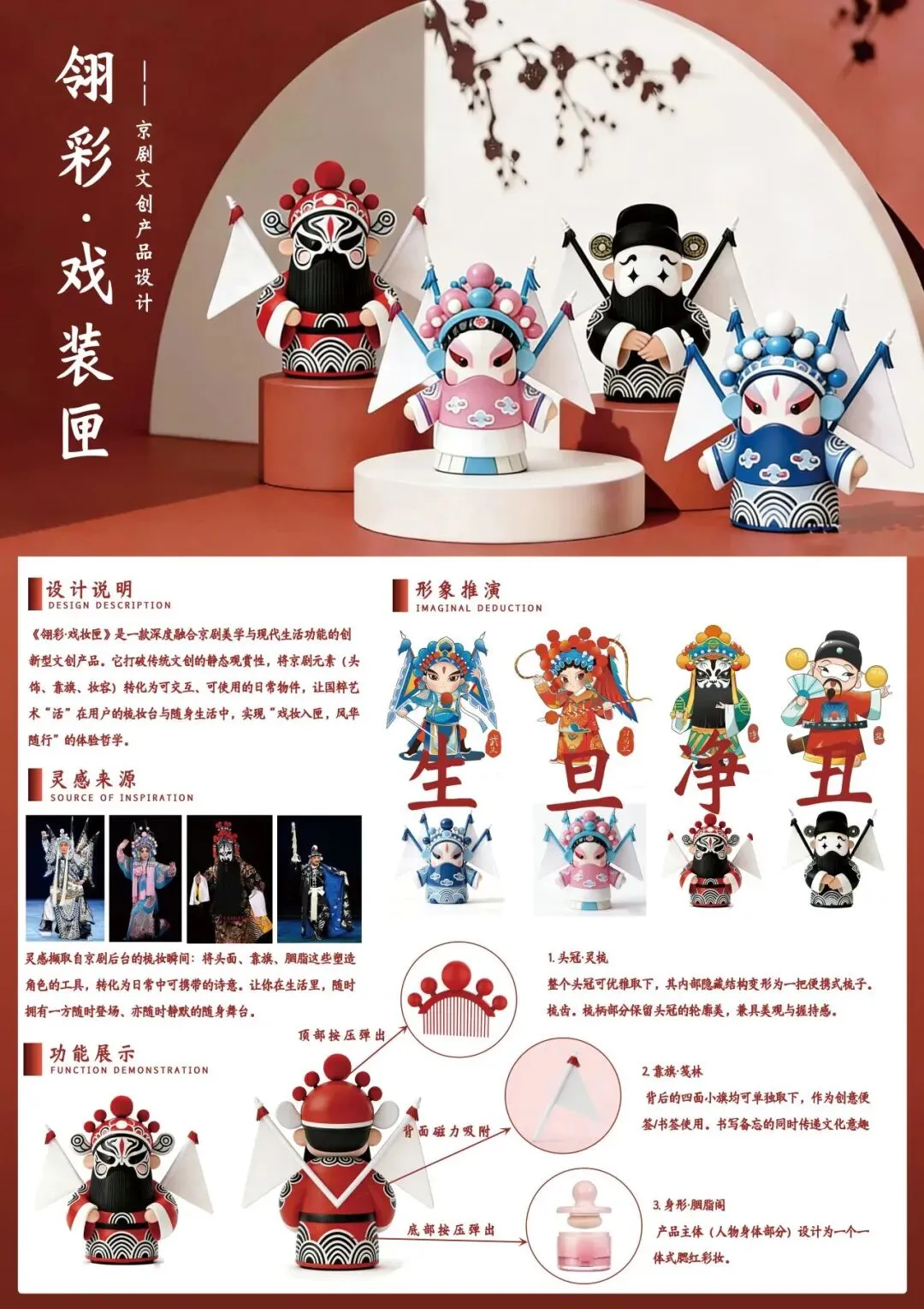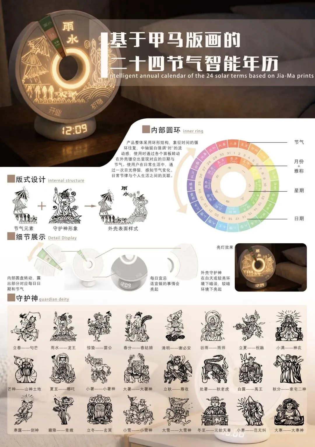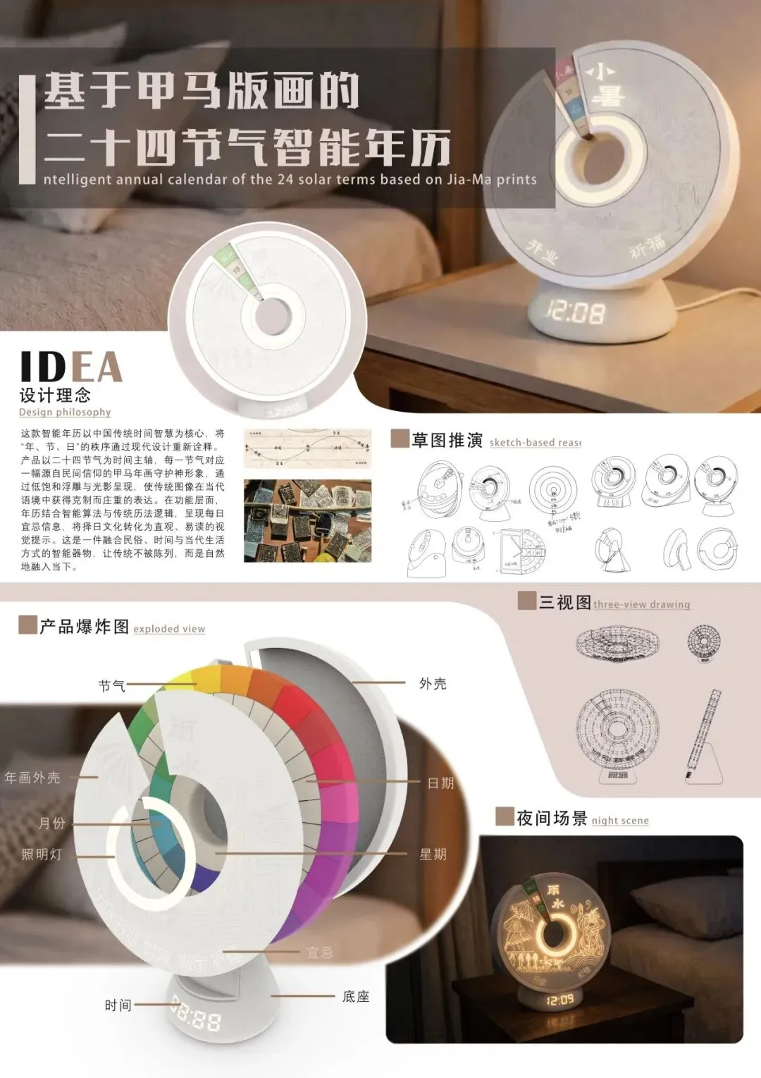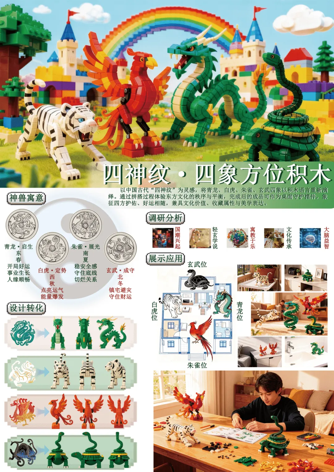在课程训练中,同学们以“问题意识”为起点,尝试把文化、生活与当代需求连接起来:有人从传统节气与民间版画中重构时间叙事,有人以“四神纹”“传统纹样”等文化符号推进当代玩具与交互体验,也有人将城市记忆、非遗工艺、戏曲美学等转译为产品系统与展陈语言。作品的价值不止于“做得像”,更在于“想得清楚、说得明白、落得下来”——让创意从想象走向逻辑,从表达走向沟通。