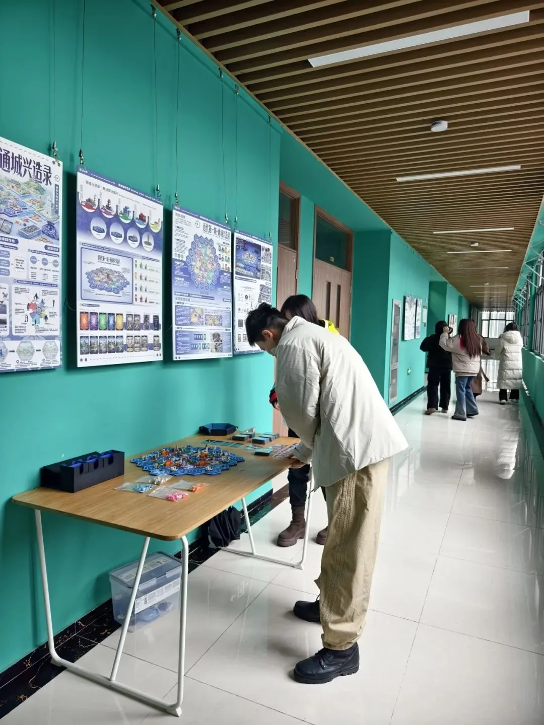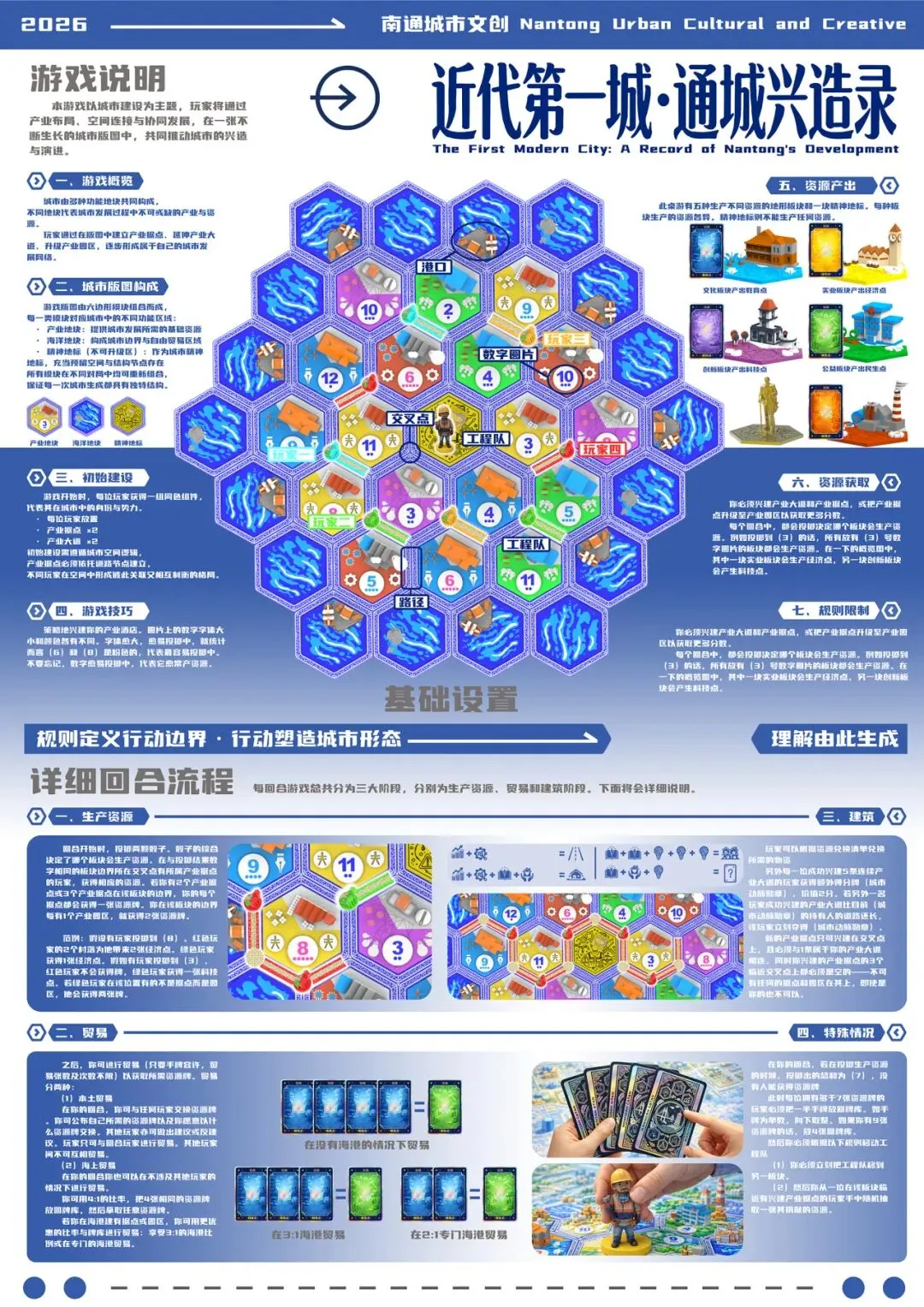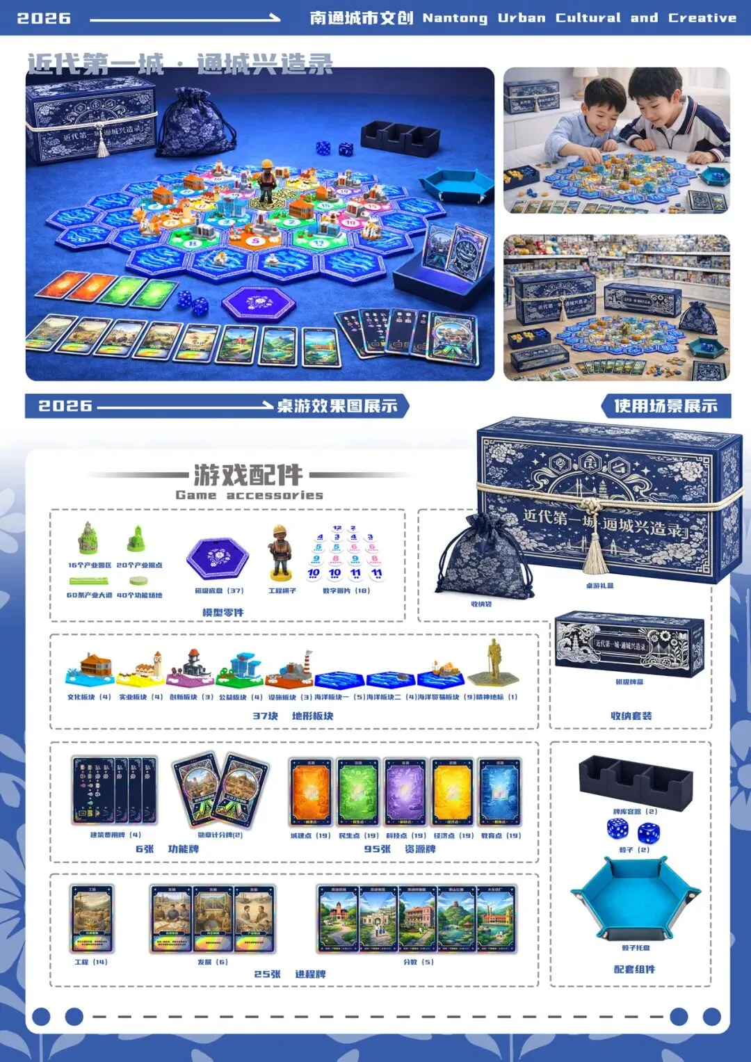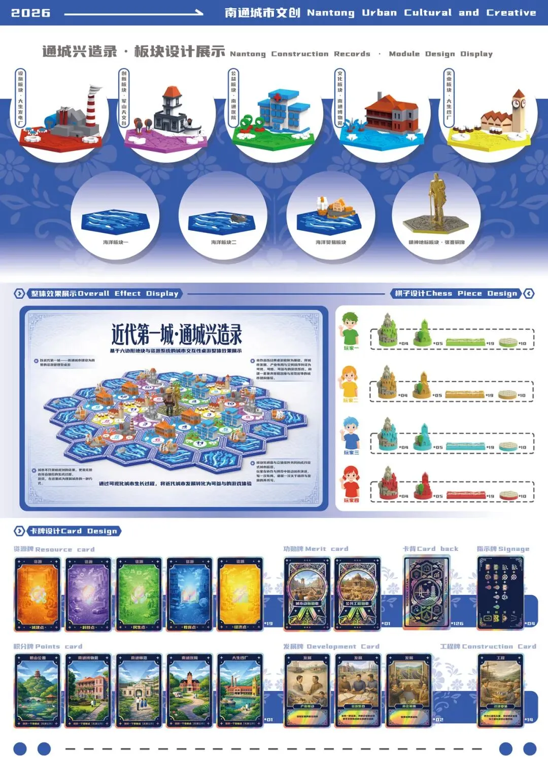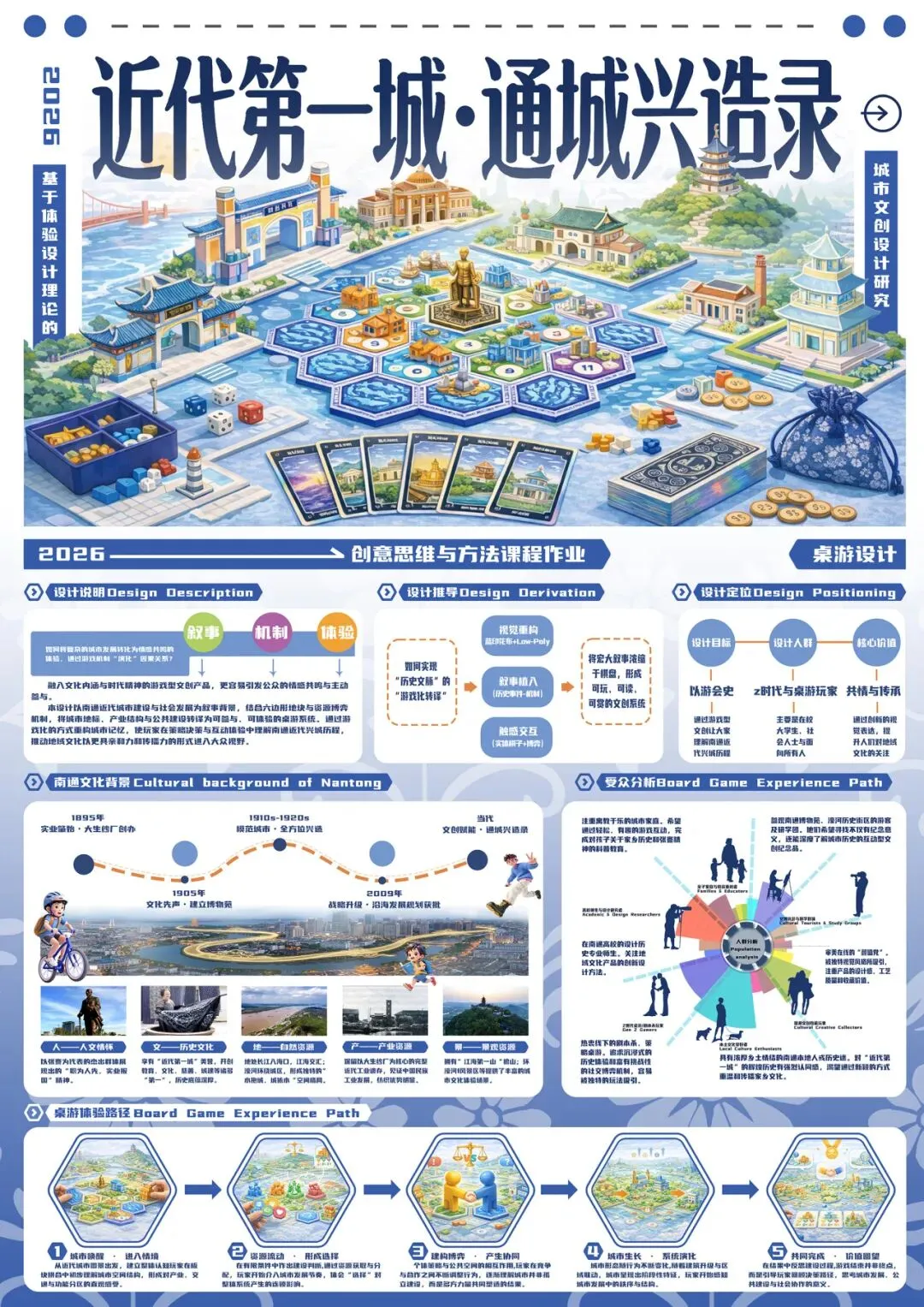 城市文创桌游系统《近代第一城·通城兴造录》:展墙以四张连续展板清晰串联“主题定位—文化线索—机制规则—配件与包装”的完整设计逻辑,桌面区同步陈列地图板块、棋子标记、卡牌与收纳配件等实物组件,让观众能够从图面推导直接对应到可玩实物,直观看到创意思维方法训练如何落到“可读、可用、可体验”的产品系统与展示现场。
