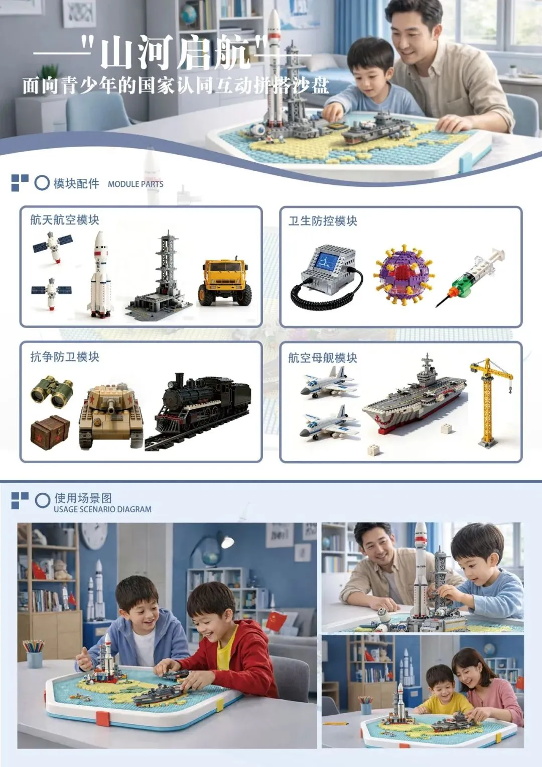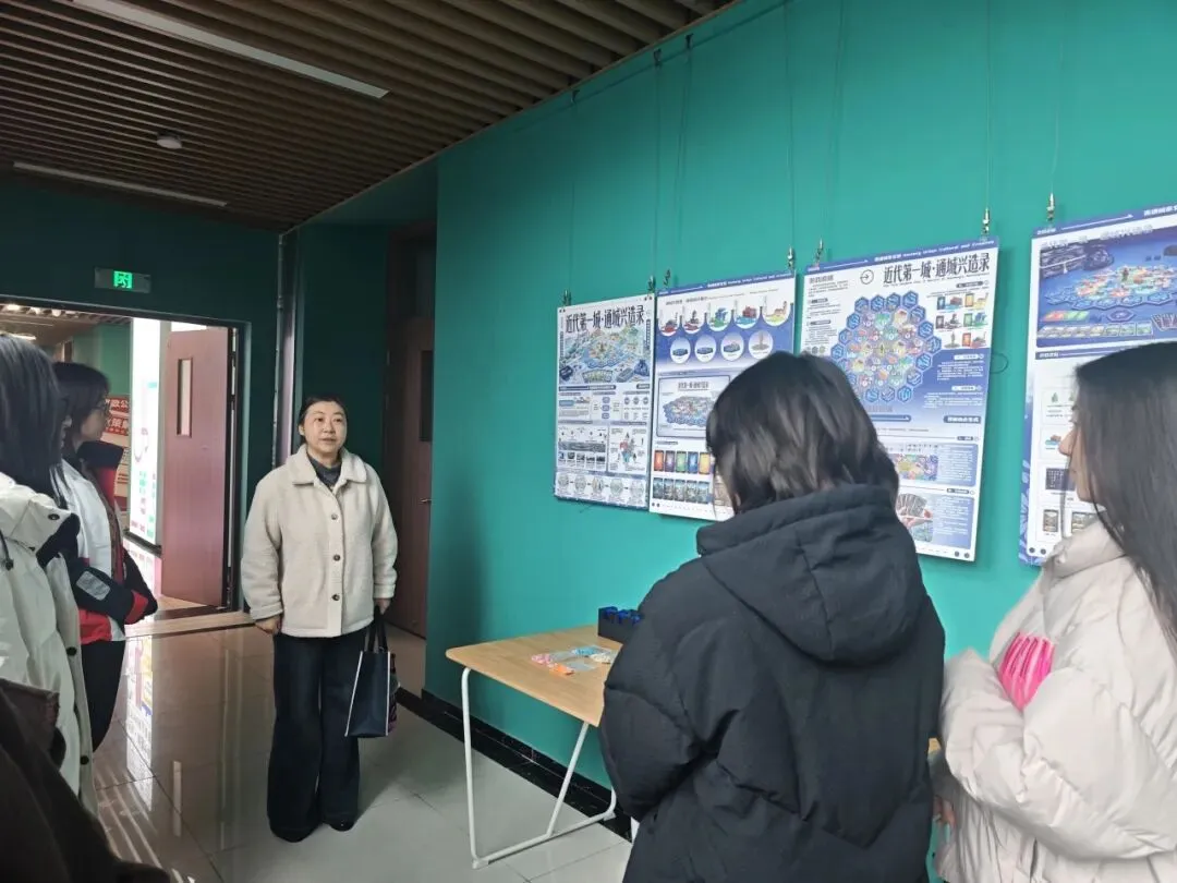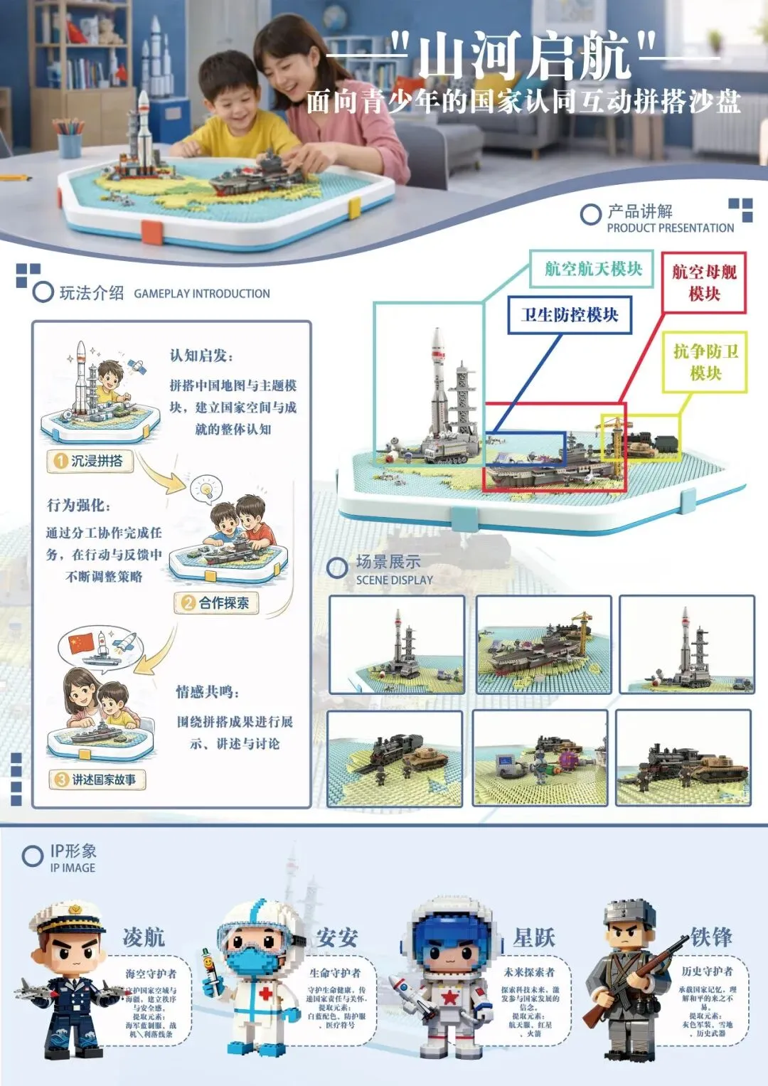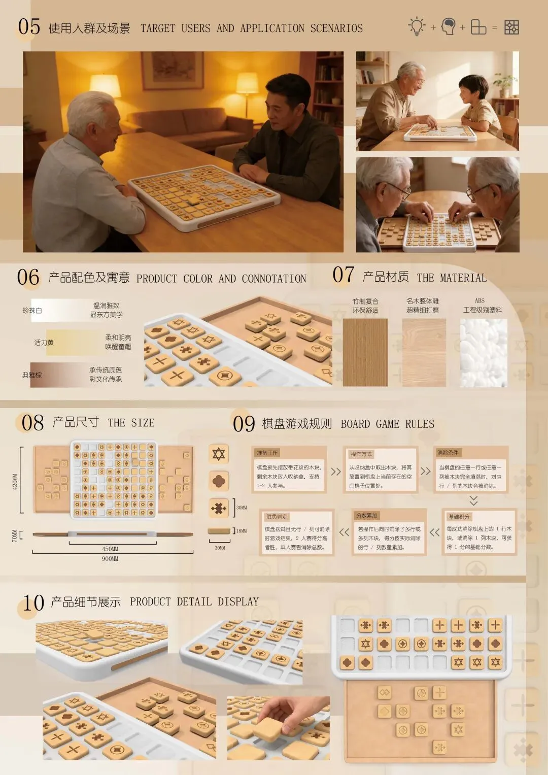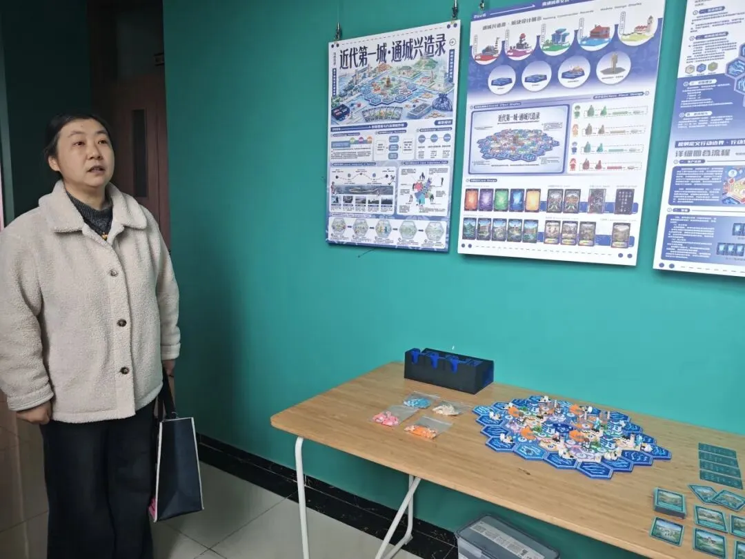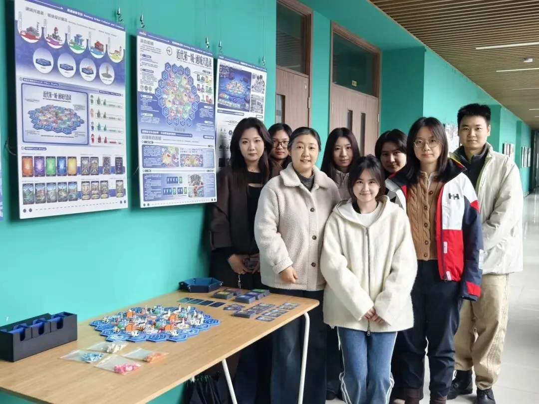 城市文创桌游系统《近代第一城·通城兴造录》:展墙以四张连续展板清晰串联“主题定位—文化线索—机制规则—配件与包装”的完整设计逻辑,桌面区同步陈列地图板块、棋子标记、卡牌与收纳配件等实物组件,让观众能够从图面推导直接对应到可玩实物,直观看到创意思维方法训练如何落到“可读、可用、可体验”的产品系统与展示现场。