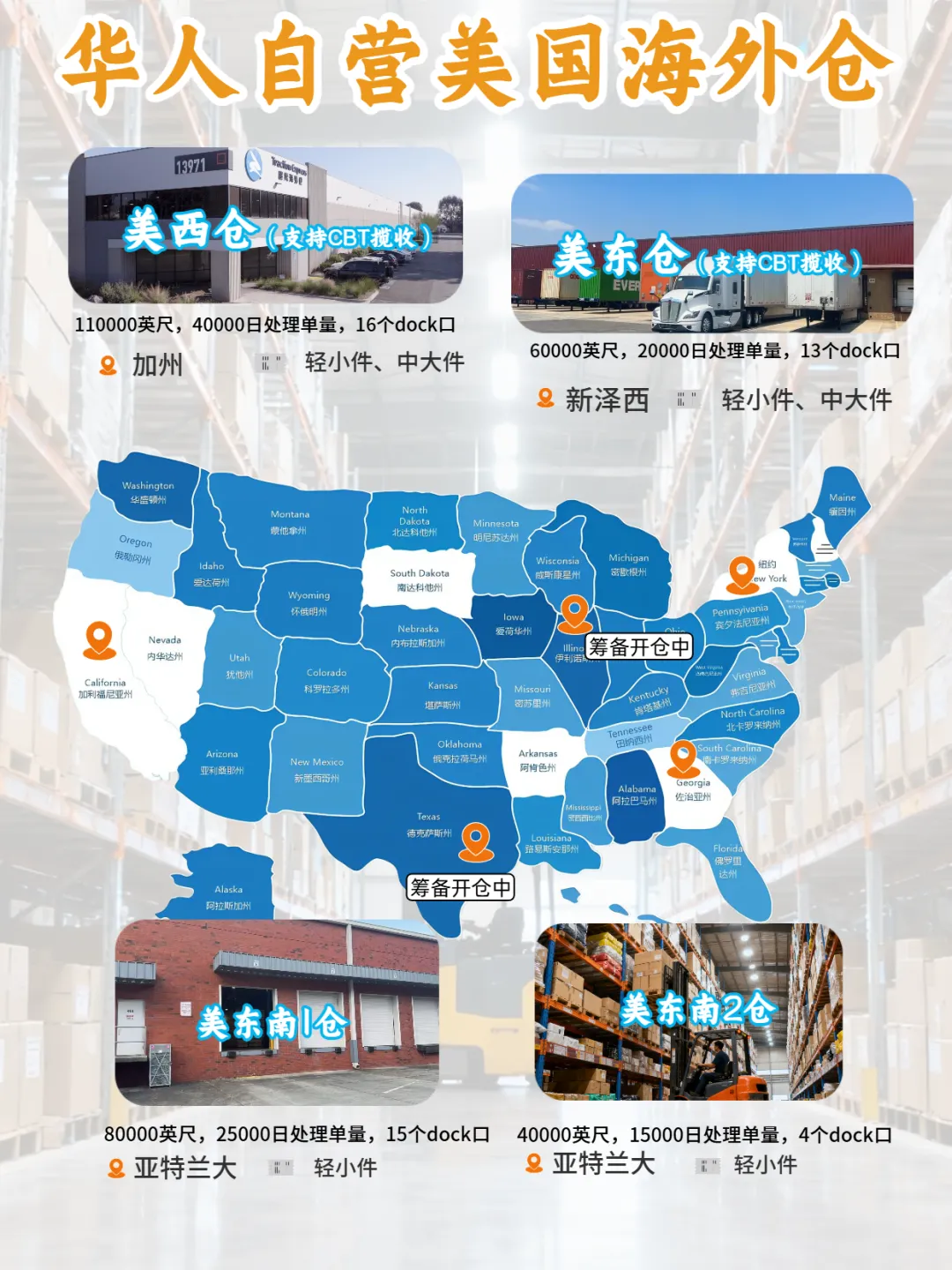 (全美仓库均有分布,面积30万尺,覆盖东西两岸)