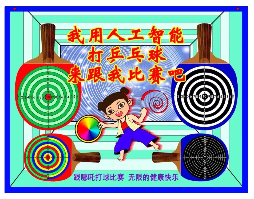 在电视动画上,根据人工智能预测的乒乓球撞击电视屏幕的位置,支持哪吒掌控绿色圆环靶、彩色圆环靶、黑白圆环靶、黑色圆环靶、乾坤圈和混天绫六种互动工具,按照需要运动变化,跟撞击电视屏幕的乒乓球进行互动,跟用户进行对抗式打球比赛。