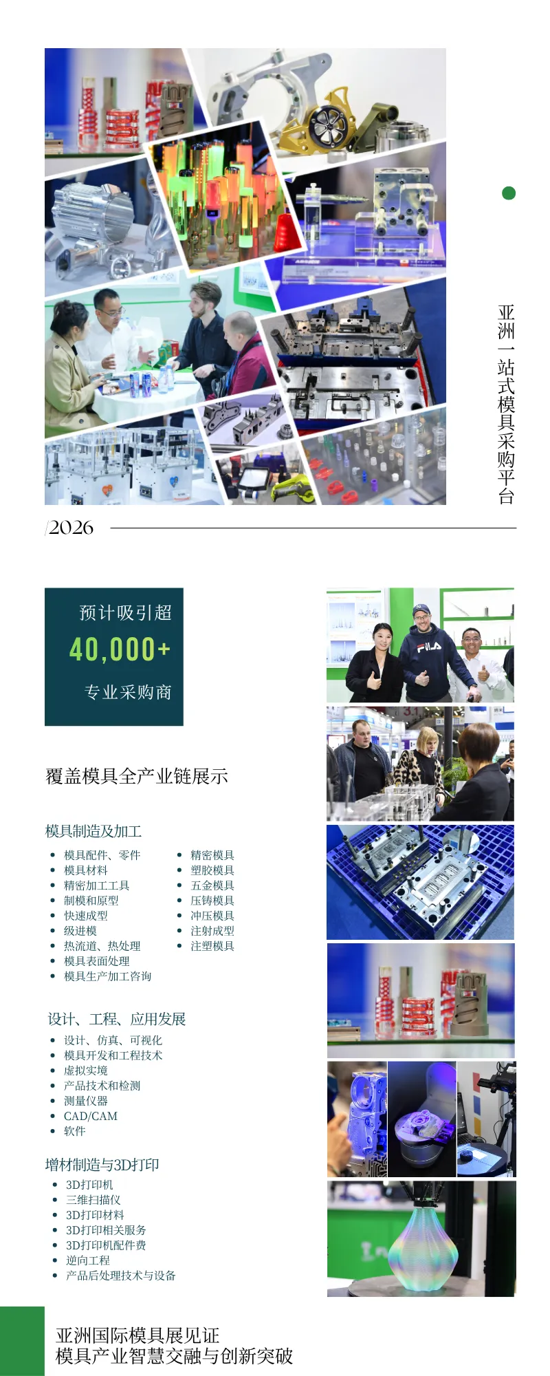 第二十届亚洲国际模具展-广州站将于2026年3月4日至6日再度登陆广交会展馆9.2展厅。与同期举办的广州工业科技展联动,本届展会将覆盖20,000平方米展区,集中展示模具、压铸、冲压和3D打印领域的前沿技术、创新产品及相关设备、材料与解决方案。此外,备受赞誉的同期活动也将重磅回归,深入探讨模具制造行业的数字化、智能化转型以及增材制造在模具生产中的关键发展方向。