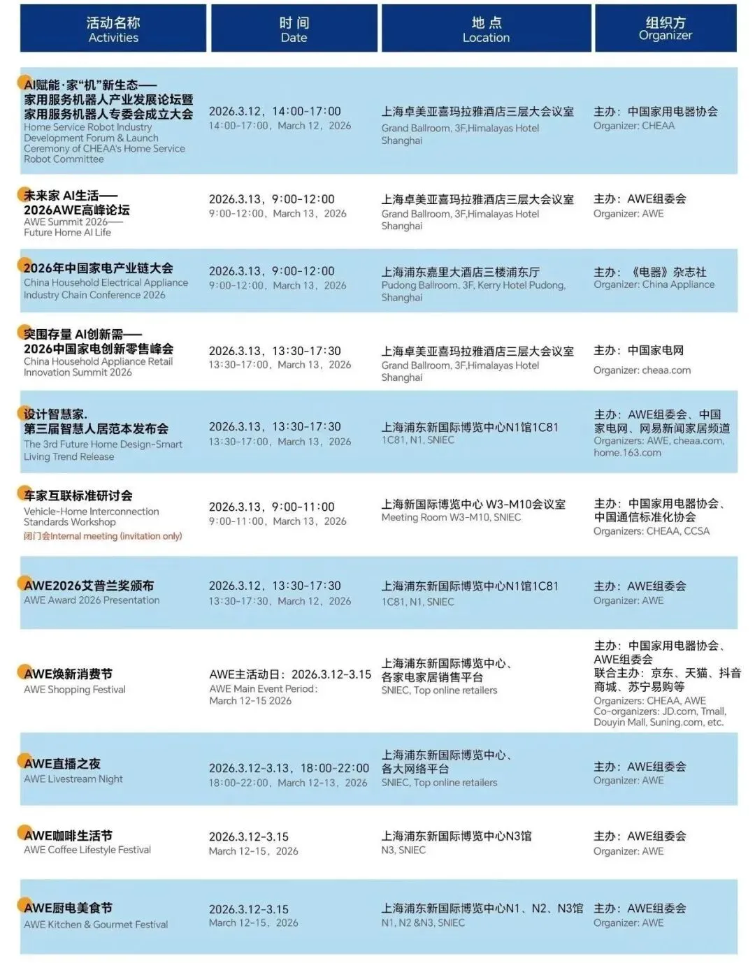 新国际展区将密集举办多场活动,如2026AWE高峰论坛、“AI赋能·家‘机’新生态”家用服务机器人产业发展论坛、2026中国家电创新零售峰会等。活动聚焦产业升级、人车家生态、新消费趋势等核心议题,为行业搭建深度交流与思想碰撞的平台。