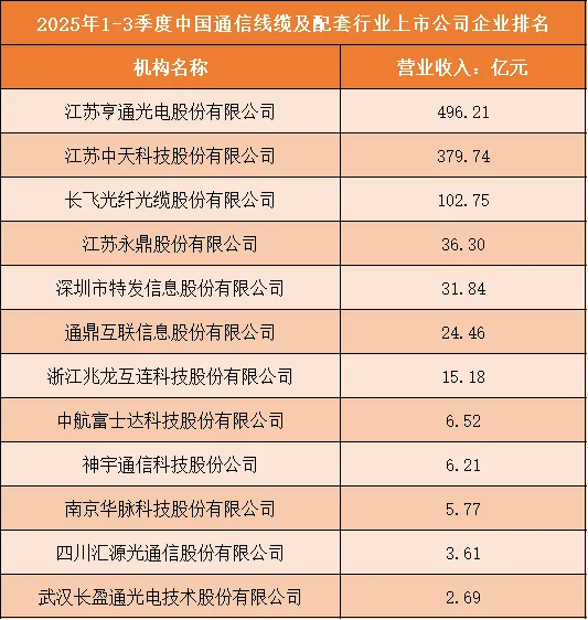 根据申万行业分类,2025年1-3季度中国通信线缆及配套行业上市公司按营业收入排名如下:(A股上市公司)