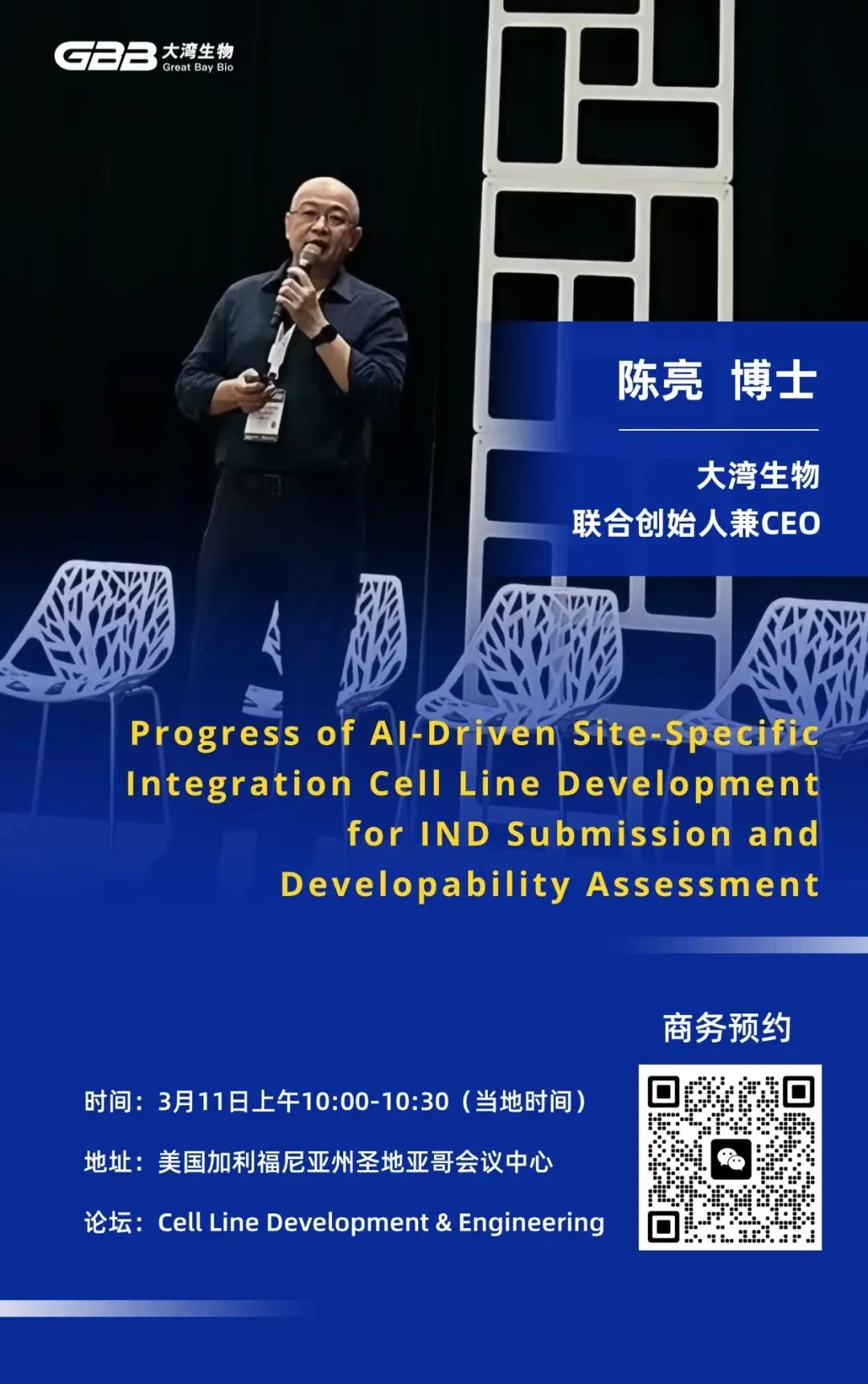 大湾生物联合创始人兼CEO陈亮博士应邀参会,并将于当地时间3月11日上午10:00-10:30,在分论坛 Cell Line Development & Engineering 以《Progress of AI-Driven Site-Specific Integration Cell Line Development for IND Submission and Developability Assessment》为主题发表演讲,展示大湾生物依托AI与定点整合技术开发细胞株的创新优势,可显著缩短客户 IND 申报周期,并助力药物分子成药性评估。