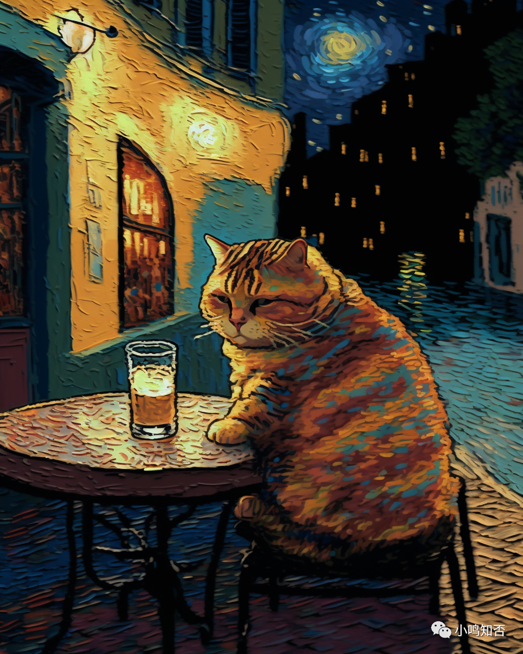 a fat cat sitting in the painting named Cafe Terrace at Night, van gogh stytle, --ar 4:5