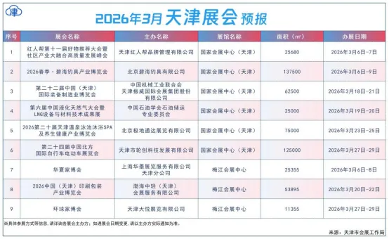 2026年3月份,国家会展中心(天津)、梅江会展中心将举办展会活动9场。主要展会活动内容预报如下: