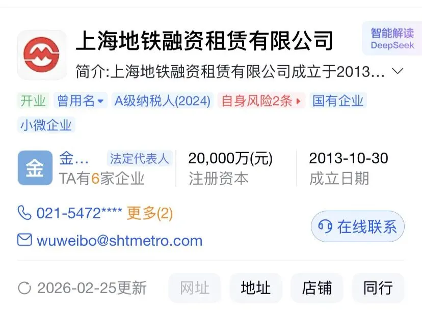 上海地铁融资租赁有限公司小编发现:该公司成立于2013年,注册资本2个亿,是正经持牌的融资租赁试点企业。评估基准日(2025年9月30日)的账面价值是2.36亿,最终评估价2.47亿,溢价5.01%。账面数据很健康:2024年营业收入1645万元,净利润575万元,净资产2.35亿元。虽然不是什么暴利生意,但胜在稳定,一年小六百万净利润进账,在地铁运营普遍亏损的大环境下,这样的公司放在金融行业来说也是个好公司。所以市场对于它的转让给出了回应,当日股票下跌2.05%。