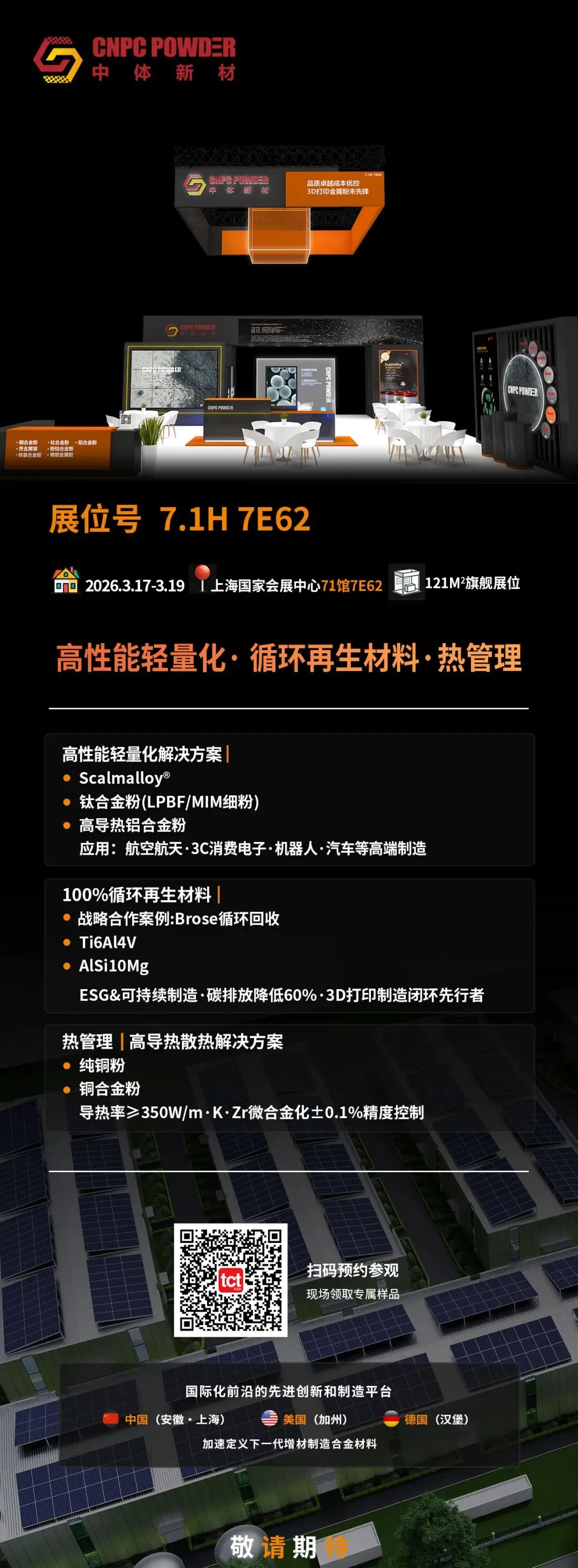 中体新材是行业领先的3D打印金属粉末解决方案提供商,专注于微米级和亚微米级高性能金属材料研发与生产技术创新。作为增材制造领域绿色智能制造的标杆,公司以国际化视野深化与合作伙伴的创新协作,为全球客户提供铝基、钛基、铁基、镍基及铜基等全系列金属粉末,广泛应用于航空航天、新能源汽车、消费电子、医疗器械等高端领域。