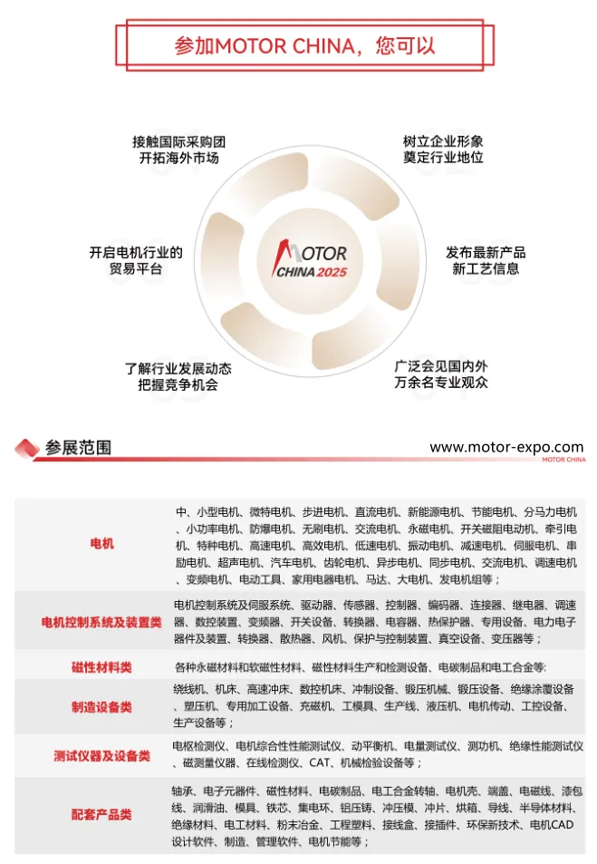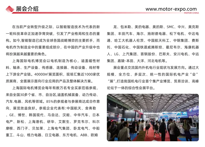 上海电机展览会于2026年7月1-3日继续在上海新国际博览中心召开!参展范围以电机制造为核心,涵盖磁性材料、轴承、生产设备、传感器、联接器、传动设备、电子元件等上下游全产业链,全面展示面向行业应用的产品及整体解决方案。每年有数万名专业买家莅临参观,来自全国30多个省、市、自治区,涵盖机械装备、动力传动、汽车、电器、风机等领域。20多年积累,凝聚行业优质供应商和买家,成熟品牌造就世界一流的行业盛会,希望通过上海电机展览会的举办能更好的为电机行业市场的开拓和发展,推动电机企业、供应企业和配套产品公司的合作共赢。作为电机行业的盛会,本届博览会聚焦于电机行业与智能化、互联网技术的深度融合,旨在推动全球电机行业的技术创新与产业升级,构建开放协作的行业生态。
