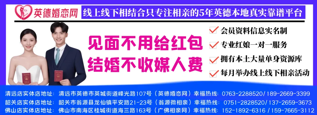 地址位于英德市区峰光路107号,店内设有洽谈区、约见私间、办公区域、牵手成功墙、公司风采展示区、每日大量上门咨询办理的单身男女嘉宾,严格的审核标准与实名认证机制,专业顾问牵线搭桥,资深红娘一对一情感指导。