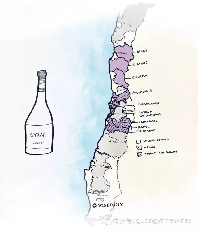在Central Valley的 Rapel Valley(包括Cachapoal 和Colchagua Valleys山谷)近期持续出产了优质的西拉。除此之外,我们也发现在Casablanca and Leyda Valleys两个山谷里面,在霞多丽边上生长的西拉品质非常好。