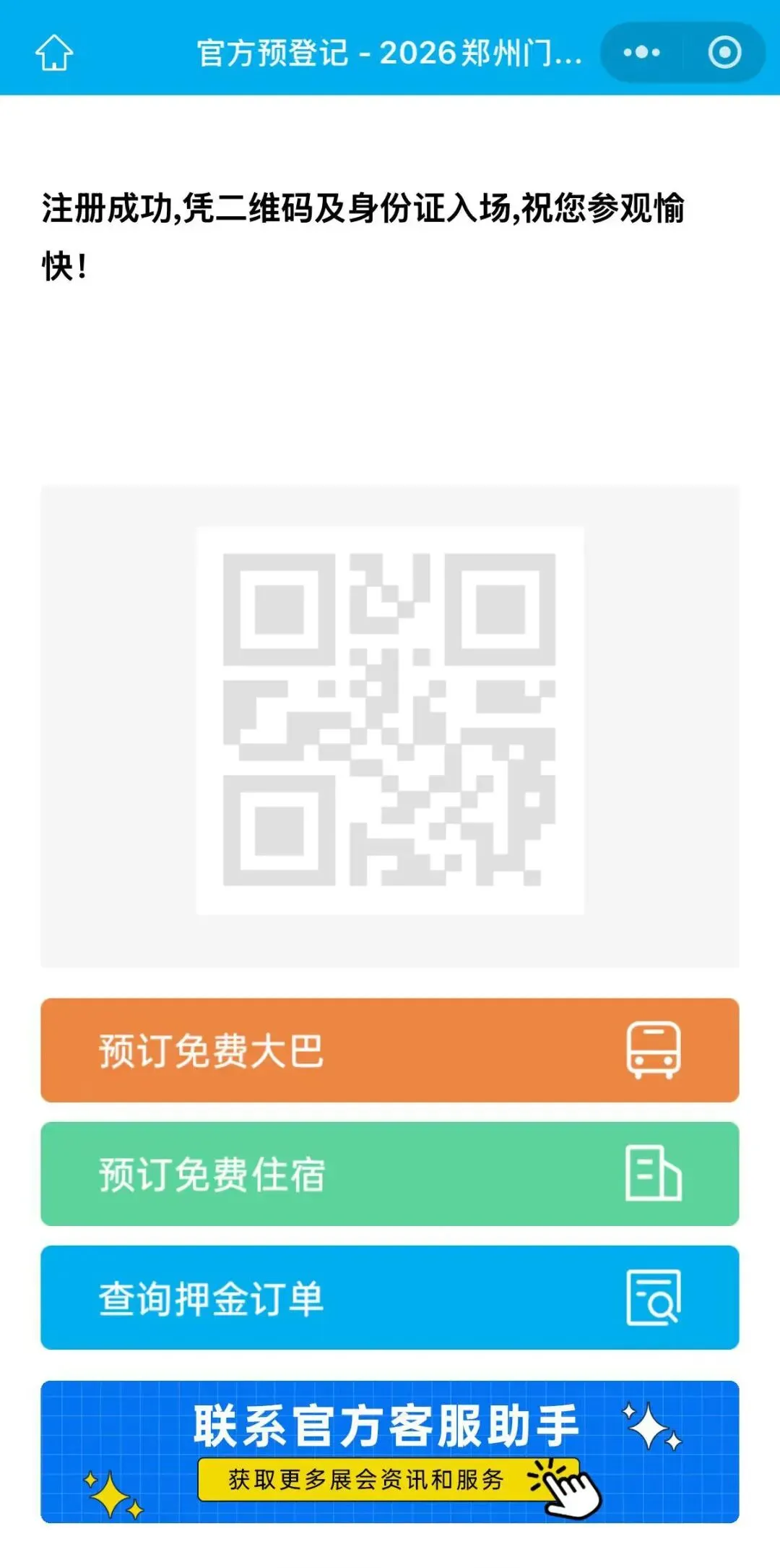 进入预登记页面,填写相关信息及调查问卷后,点击提交,即完成参观报名。完成预登记后,即可在展会现场凭此二维码过闸机入场。