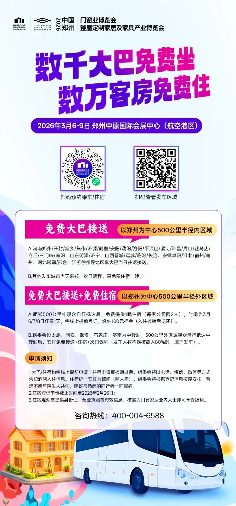 同时,组委会以郑州为中心,为大巴次日返程及500公里以外区域的专业观众,免费提供一晚住宿,若有需求可点击“预订免费住宿”。