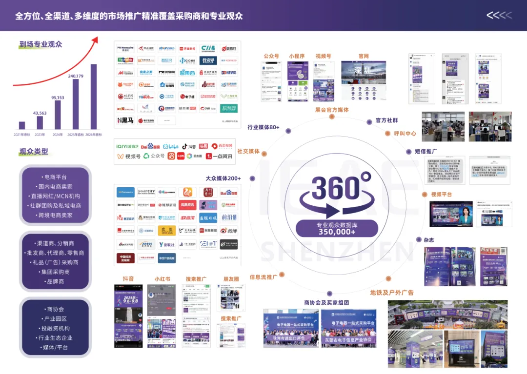 为给展商构建一个充满商机的高质量贸易平台,IEAE深圳电子展将通过线上线下双渠道相融合,进行主动、广泛且精准的市场推广营销,最大程度有效吸引全球范围内的专业买家、采购团、经销商及行业决策者到访,从而极大提升展商的曝光度与潜在客户触达率。使企业得到更高的投资回报率,不仅能直接促成订单与合作,更能高效地进行品牌宣传、洞悉市场趋势、建立行业人脉,并在激烈的竞争中树立品牌形象!