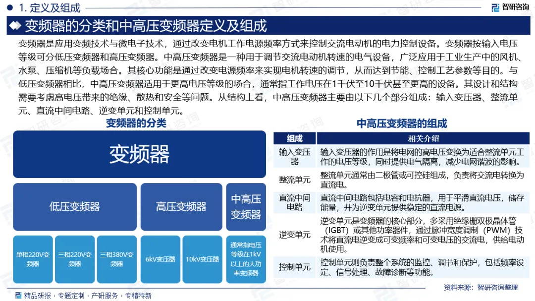 中高压变频器是一种用于调节交流电动机转速的电气设备,广泛应用于工业生产中的风机、水泵、压缩机等负载场合。其核心功能是通过改变电源频率来实现电机转速的调节,从而达到节能、控制工艺参数等目的。与低压变频器相比,中高压变频器适用于更高电压等级的场合,通常指工作电压在1千伏至10千伏甚至更高的设备。其设计和结构需要考虑高电压带来的绝缘、散热和安全等问题。从结构上看,中高压变频器主要由以下几个部分组成:输入变压器、整流单元、直流中间电路、逆变单元和控制单元。中高压变频器在工业生产中扮演着重要角色,主要用于调节电动机的转速和运行状态,以适应不同的工艺需求。这类设备通常应用在风机、水泵、压缩机等负载场合,通过调整电机输入电压和频率,实现节能和工艺控制的目的。中国中高压变频器行业的快速发展,主要由国家“双碳”战略驱动下的产业升级与政策支持所拉动。在“双碳”目标背景下,电力、冶金、化工、石化等高耗能行业为达成节能减排的硬性要求,集中开展了以产能置换、技术改造和绿色转型为核心的产业升级。这一过程极大地释放了对中高压变频器这一核心节能设备的需求,例如在冶金行业,严格的环保限产与差异化电价政策直接刺激了相关改造项目的投资。同时,大型炼化一体化等国家级重大项目的持续建设,也促进了中高压变频器的需求增长。数据显示,中国中高压变频器行业市场规模从2017年的108亿元增长至2024年的216亿元,年复合增长率为10.41%。在“双碳”背景下,传统重工业产业结构会持续优化,产业升级项目会持续释放,叠加数字化需求的提升,中高压变频器市场需求仍然保持稳定增长态势。中国中高压变频器行业已形成以国际知名品牌与国内领军企业共同主导的多元化竞争格局。以施耐德、ABB、西门子及东芝三菱为代表的国外企业,凭借先进的技术体系、完整的解决方案和全球化的服务网络,在高端市场及部分关键行业中保持显著优势。与此同时,以汇川技术、英威腾、合康新能、智光电气、利雅得电气、希望森兰等为代表的国内企业正加速崛起,依托本土化服务响应速度、持续提升的研发实力以及更具竞争力的产品性价比,不断在中高端市场扩大份额,并在部分细分领域实现突破。整体市场呈现技术驱动、应用深化与国产替代进程并行的竞争态势。