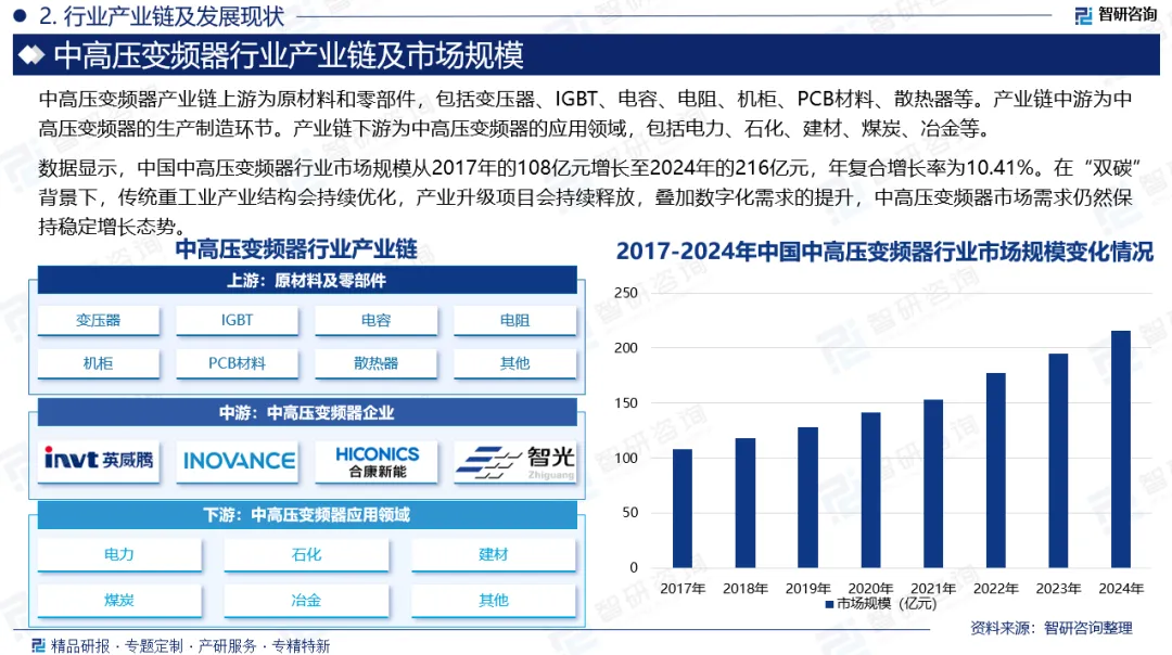 市场规模:中高压变频器在工业生产中扮演着重要角色,主要用于调节电动机的转速和运行状态,以适应不同的工艺需求。这类设备通常应用在风机、水泵、压缩机等负载场合,通过调整电机输入电压和频率,实现节能和工艺控制的目的。中国中高压变频器行业的快速发展,主要由国家“双碳”战略驱动下的产业升级与政策支持所拉动。在“双碳”目标背景下,电力、冶金、化工、石化等高耗能行业为达成节能减排的硬性要求,集中开展了以产能置换、技术改造和绿色转型为核心的产业升级。这一过程极大地释放了对中高压变频器这一核心节能设备的需求,例如在冶金行业,严格的环保限产与差异化电价政策直接刺激了相关改造项目的投资。同时,大型炼化一体化等国家级重大项目的持续建设,也促进了中高压变频器的需求增长。数据显示,中国中高压变频器行业市场规模从2017年的108亿元增长至2024年的216亿元,年复合增长率为10.41%。在“双碳”背景下,传统重工业产业结构会持续优化,产业升级项目会持续释放,叠加数字化需求的提升,中高压变频器市场需求仍然保持稳定增长态势。