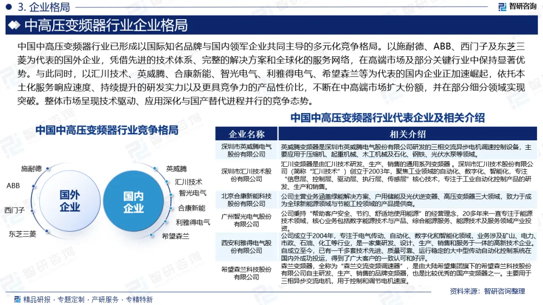 企业格局:中国中高压变频器行业已形成以国际知名品牌与国内领军企业共同主导的多元化竞争格局。以施耐德、ABB、西门子及东芝三菱为代表的国外企业,凭借先进的技术体系、完整的解决方案和全球化的服务网络,在高端市场及部分关键行业中保持显著优势。与此同时,以汇川技术、英威腾、合康新能、智光电气、利雅得电气、希望森兰等为代表的国内企业正加速崛起,依托本土化服务响应速度、持续提升的研发实力以及更具竞争力的产品性价比,不断在中高端市场扩大份额,并在部分细分领域实现突破。整体市场呈现技术驱动、应用深化与国产替代进程并行的竞争态势。