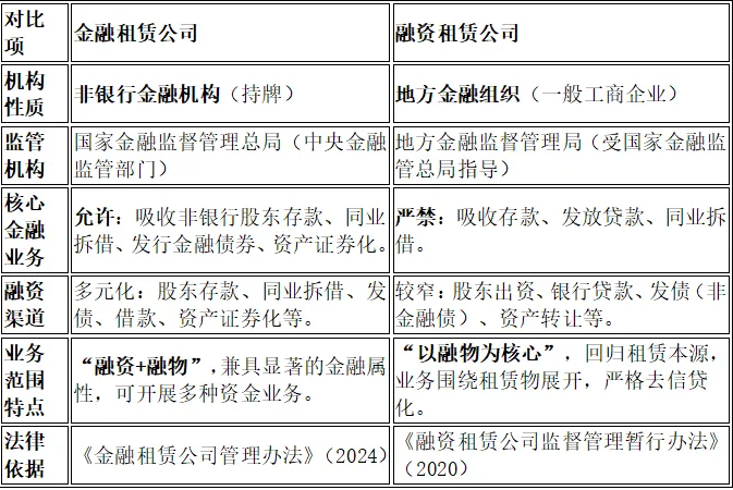 以下是基于《金融租赁公司管理办法》(2024年版)和《融资租赁公司监督管理暂行办法》(2020年版)等核心规定的详细对比: