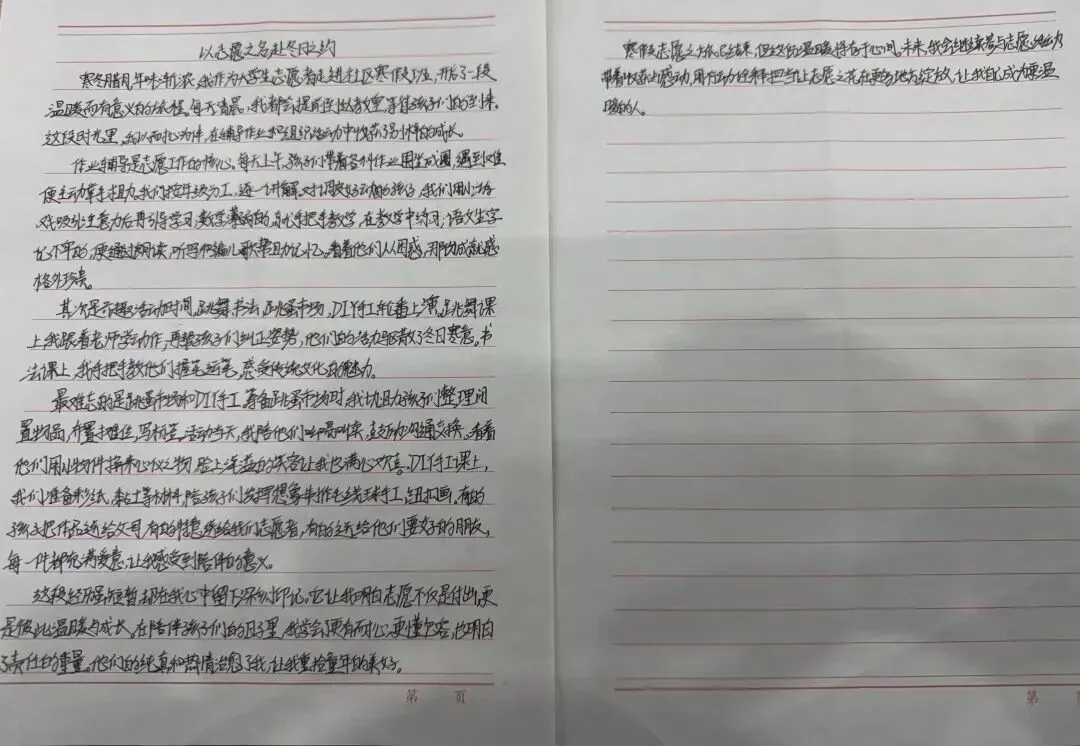 寒冬腊月,年味渐浓。社区里的大学生志愿者用一笔一划,写下了这个寒假最温暖的回忆。从清晨的作业辅导,到多彩的趣味课堂;从热闹的跳蚤市场,到充满创意的 DIY 手工,志愿者们用耐心与陪伴,为孩子们的假期添上了亮丽的色彩。这份手写的心得,不仅是一段经历的记录,更是志愿精神最生动的注脚。它告诉我们,志愿不仅是付出,更是彼此温暖与成长。让我们一起,从这份真挚的感悟中,汲取继续前行的力量,让志愿之花在社区的每个角落绽放。