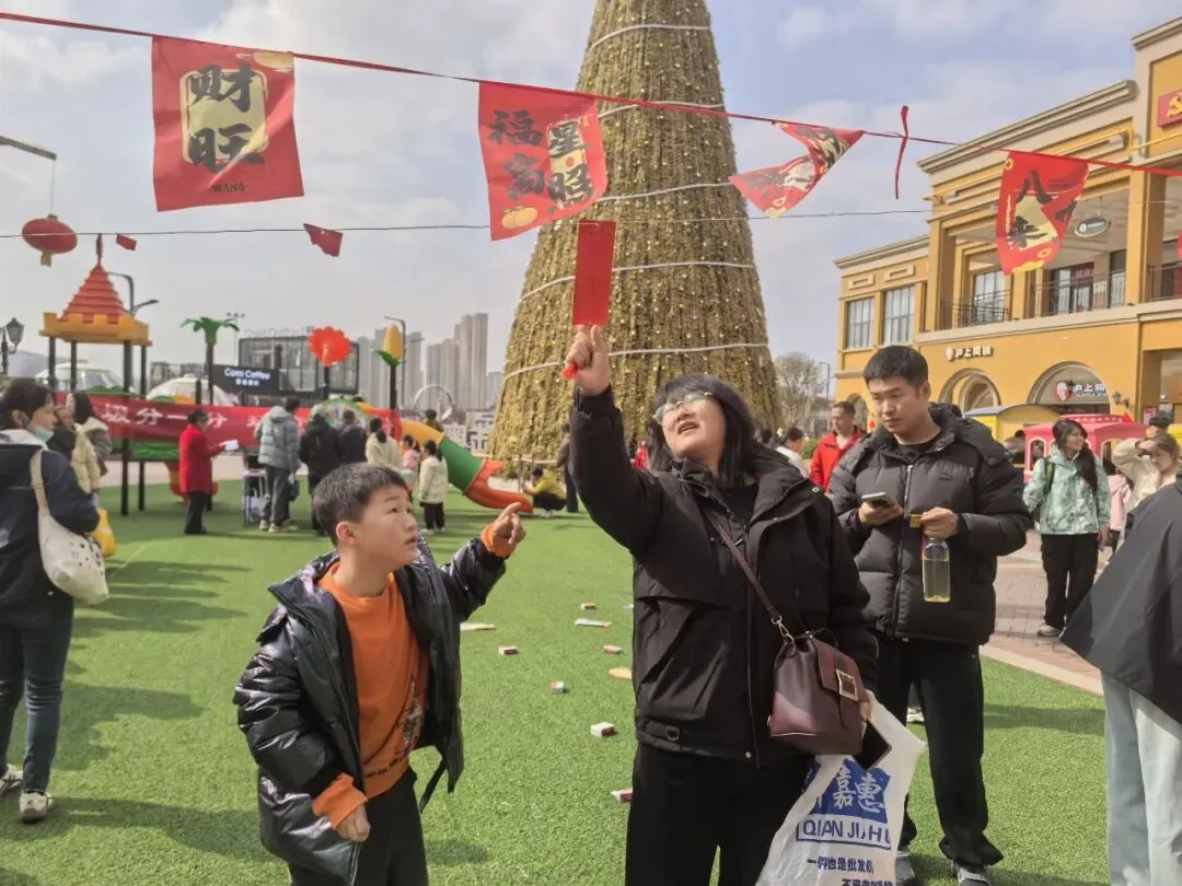 活动现场张灯结彩,年味十足。奥莱购物公园的西广场挂满了五颜六色的灯谜,谜面涵盖了传统文化、生活常识、生肖、成语等多个类别,既具趣味性又有知识性。居民们三五成群,驻足凝神,有的独自沉思,有的互相探讨,猜中谜底的居民喜笑颜开地兑换奖品,现场欢声笑语不断。