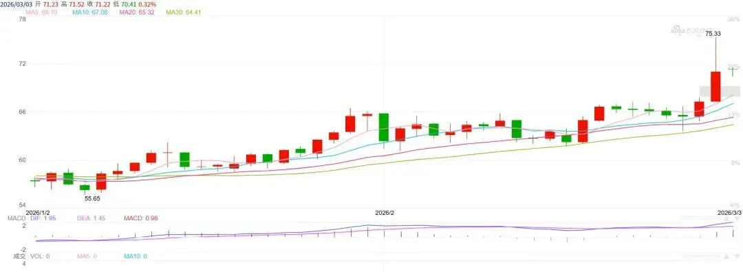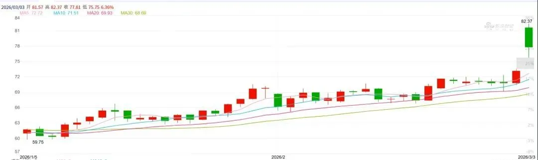 受近期地缘冲突加剧,国际原油价格于3月2日出现大幅跳涨,布伦特、WTI双双大幅冲高,布伦特原油盘中一度飙升至82.37美元/桶,日内最大涨幅12.59%;WTI原油同步冲高至75.33 美元/桶,涨幅11.95%。