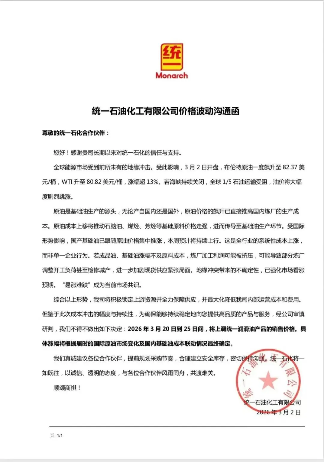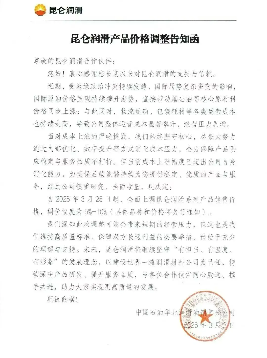 2026年3月2日昆仑润滑发布了产品价格调整告知函,自2026年3月25日起,全面上调昆仑润滑系列产品销售价格,调价幅度为5%-10%(具体品种和价格将另行通知)。
