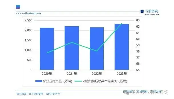 图表2:2020-2023年中国铝挤压材产量及挤压模具市场规模(万吨,亿元)