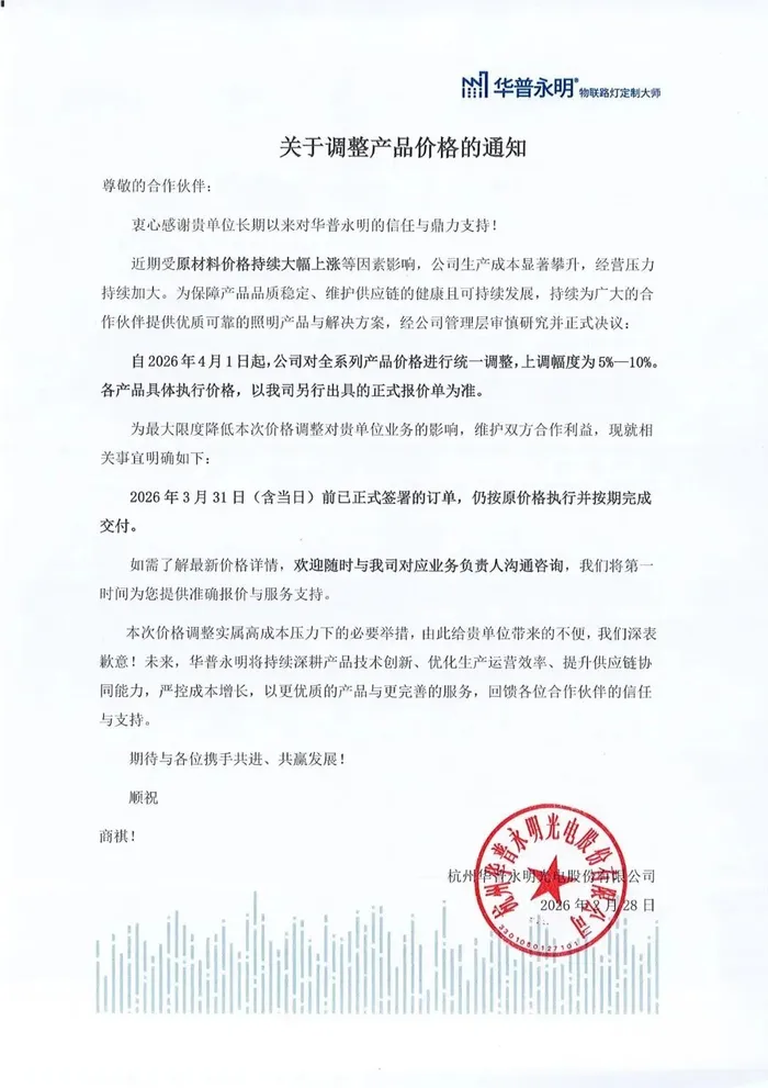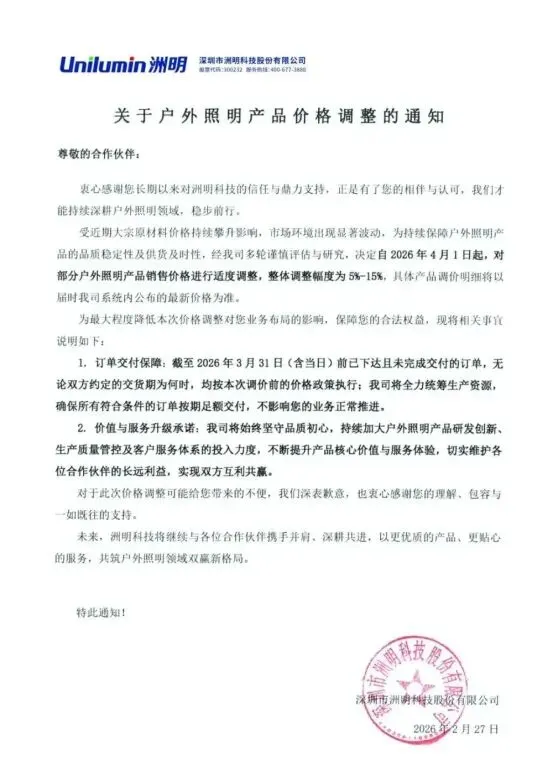 2026年春节后,照明行业迎来新一轮密集调价潮。截至3月2日,春节后发布涨价通知的相关企业超24家,开年累计涨价企业突破50家。这场覆盖全产业链的涨价,是成本承压、供应链调整与竞争逻辑转变共同作用的结果。
