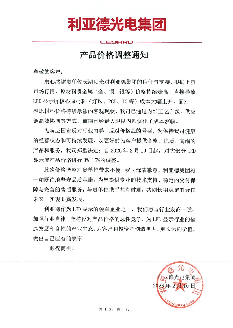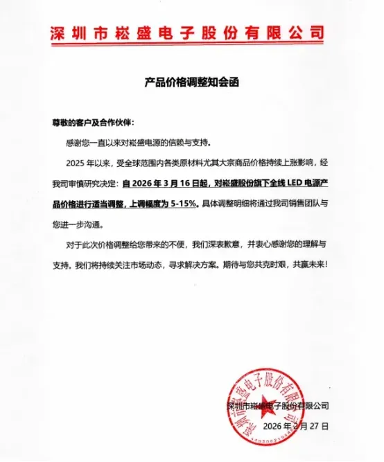 中游封装与电源企业是涨价主力。崧盛股份3月1日宣布3月16日起全线LED电源涨价5%-15%,直指大宗商品涨价影响;华普永明2月28日通知4月1日起全系列产品涨价5%-10%,保障品质与供应链稳定。莱福德等企业同步跟进,RGB灯珠因智能座舱等需求激增涨幅8%-15%,常规封装产品涨幅3%-6%。