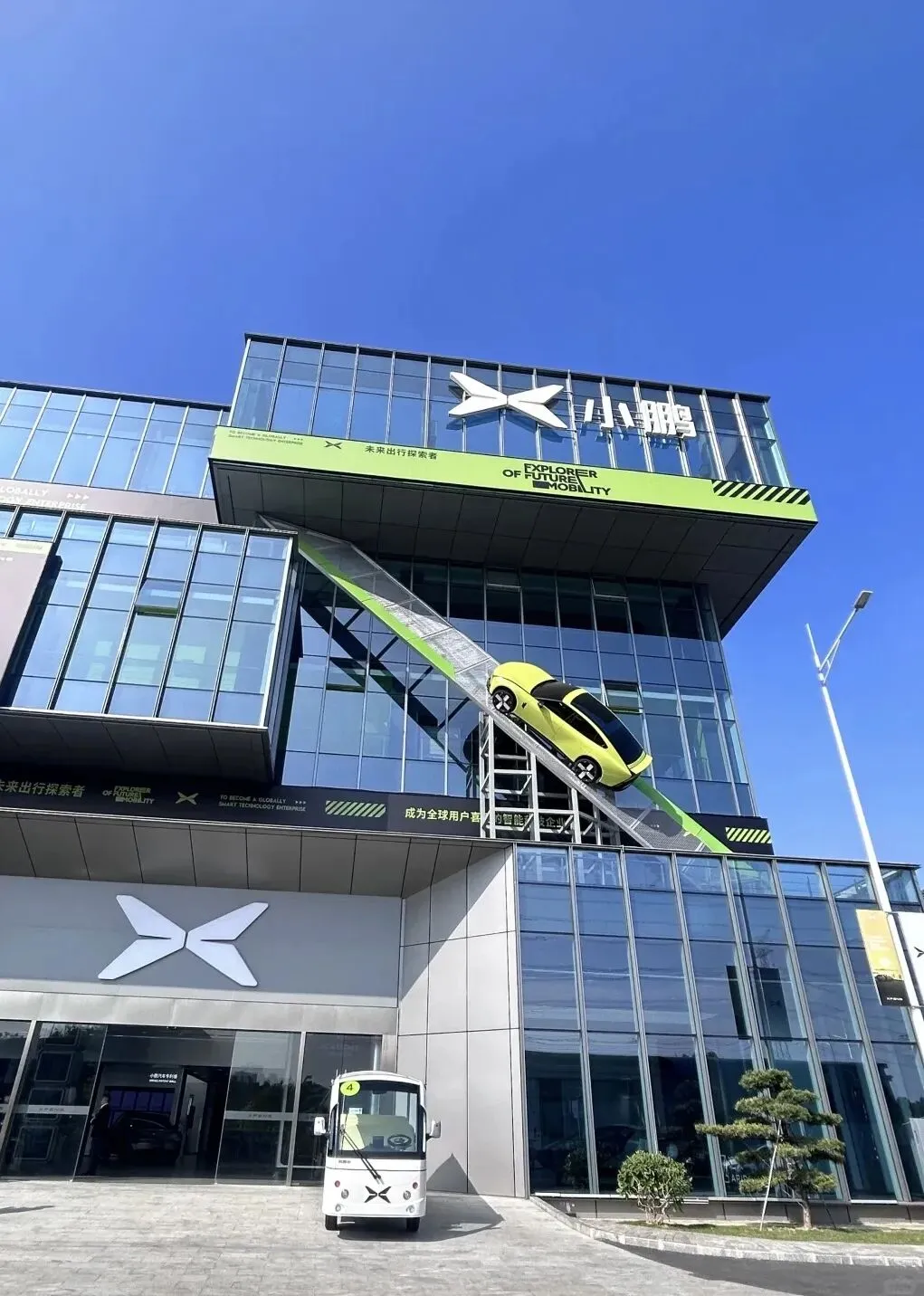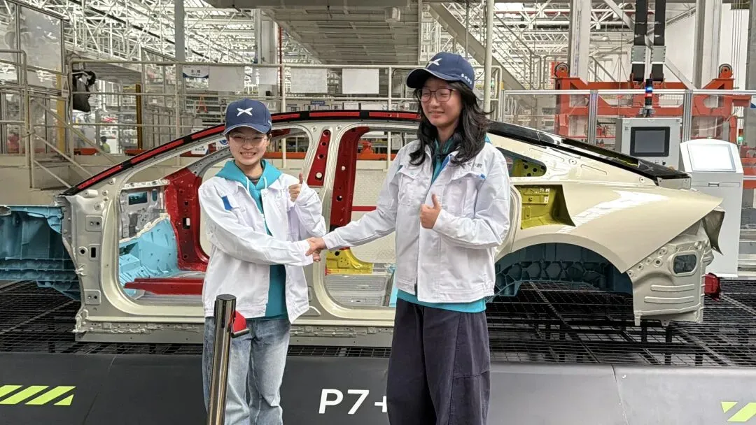 走进广州智造基地1号大门时,晨光刚好斜斜地照在展厅大楼上——那辆悬挂着的P7 003号车,车身反射出柔和却有力量的光泽,格外亮眼。