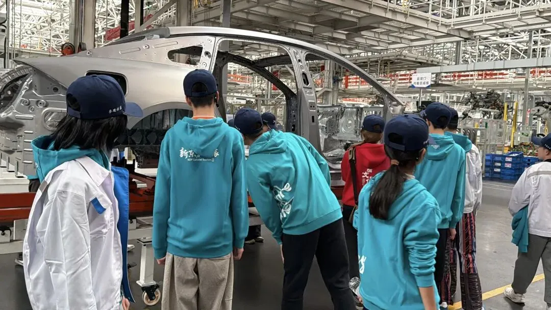一位男同学,蹲在一体化压铸车身旁,手指轻轻抚过拼接纹路,嘴里喃喃自语 “原来无焊点工艺是这样的”,一边说一边招呼同学一起来看——足足停留了10分钟。