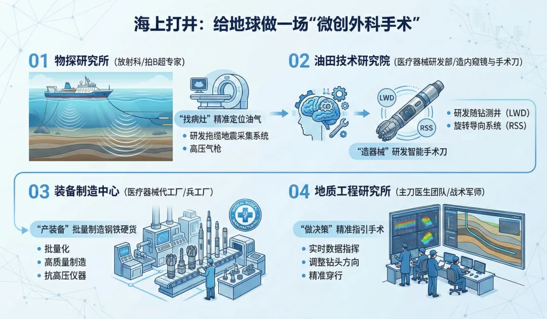 如果把“海上打井”比作给地球做一场“微创外科手术” ,这四个部门的职能分工就非常清晰了: