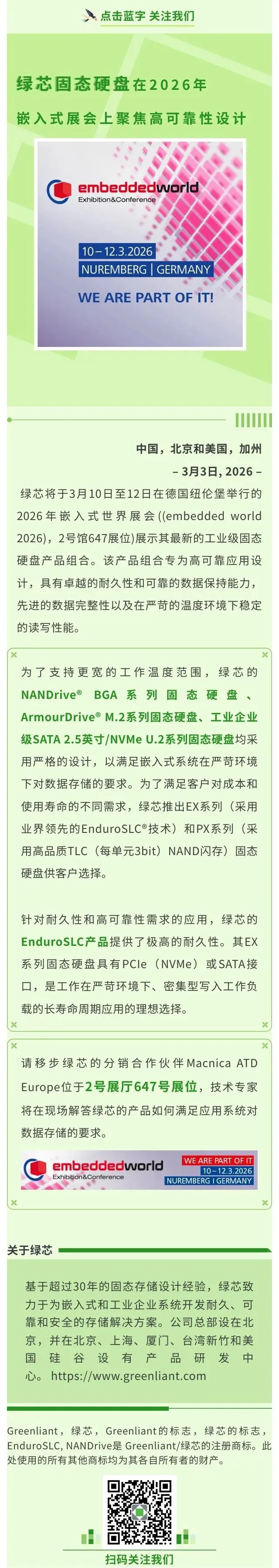 绿芯固态硬盘在2026年嵌入式展会上聚焦高可靠性设计