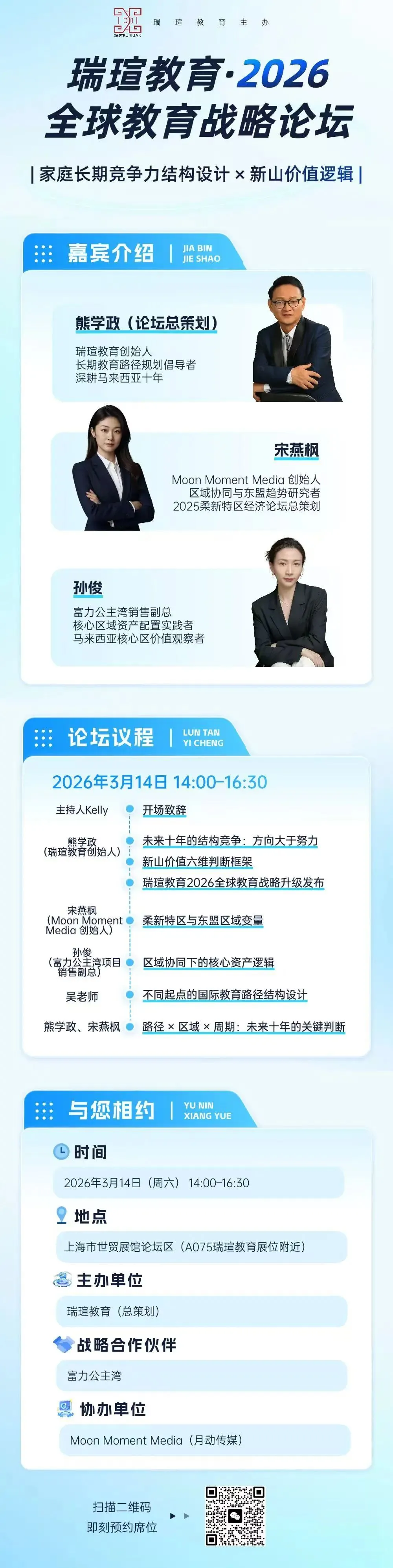服务模式全面升级:不再只做单一的课程规划,而是为每个孩子定制一套专属的、系统化的教育解决方案,从学习到成长,全方位覆盖; 全球资源一键整合:联合优质学校、国际课程机构和专业教育服务团队,形成全链条教育生态,让接触到顶尖教育资源; 专业品牌更值得信赖:这次首次对外发布全球教育战略,也是想让各位家长看到,瑞瑄有能力、有决心,成为大家身边专业的国际教育决策顾问;