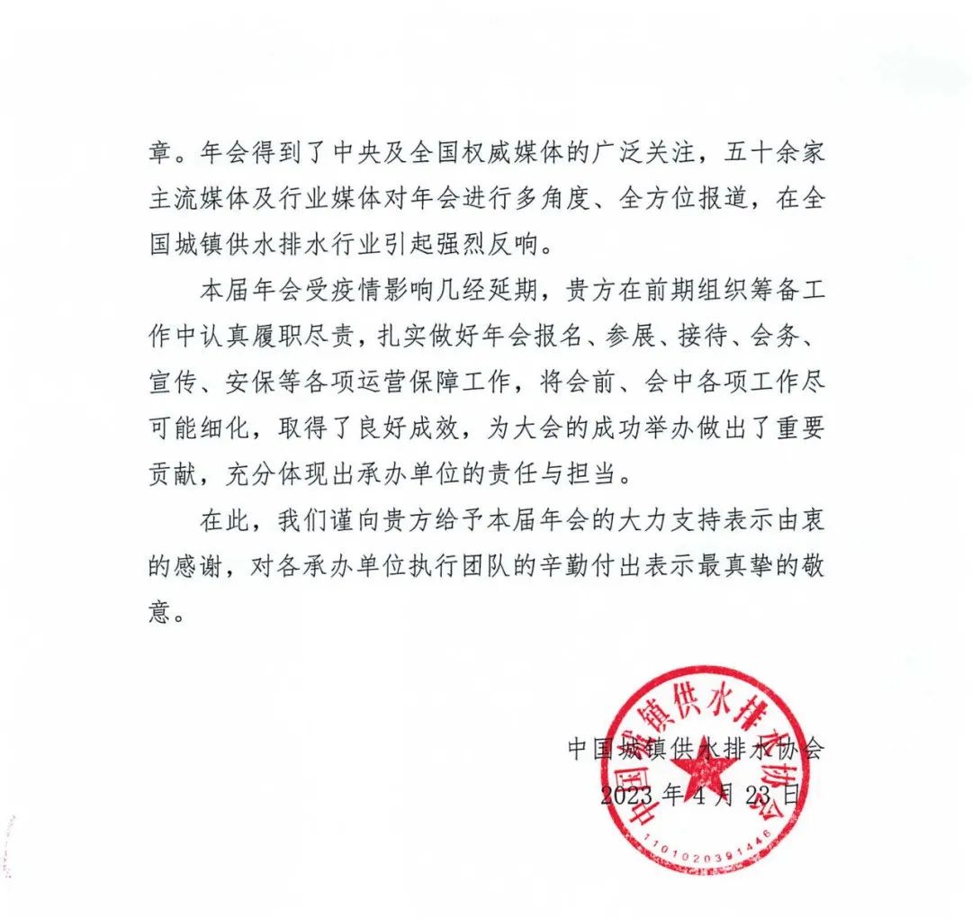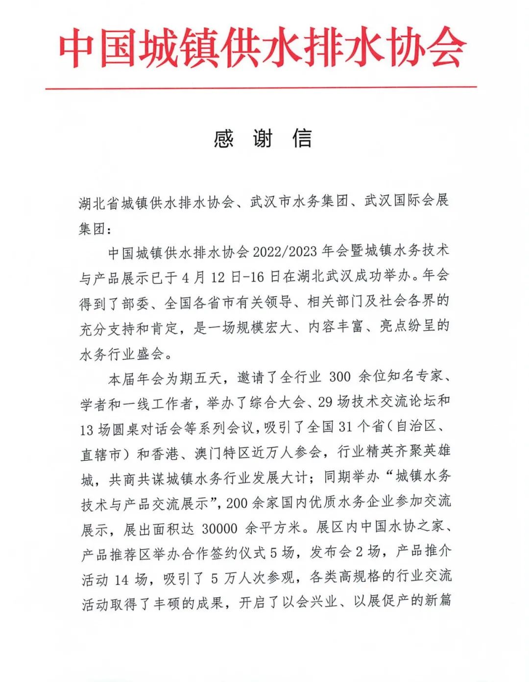 近日,主办方中国城镇供水排水协会特发来感谢信,对武汉国际会展集团扎实的工作、做出的重要贡献、展现出的责任与担当,表示由衷的感谢和最真挚的敬意。