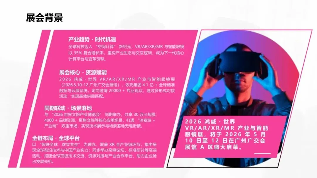 展会同步举办主旨论坛、供需对接会、行业创新大奖 “金威奖” 评选等重磅活动,更联动2026世界文旅产业博览会,打通 “消费端 + 产业端” 场景落地,促进产业协同发展,拉动区域经济增长。从政策解读到技术交流,从产品展示到商业变现,这场兼具专业性与影响力的行业盛会,将成为XR产业高质量发展的核心引擎。