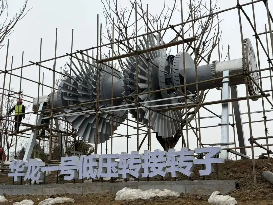 “华龙一号”核电汽轮机低压焊接转子的雕塑化呈现,有着国家核电装备的象征意义。该雕塑高度5.6米,外围及底座依然采用304不锈钢激光切割下料,中间机器模型采用FGF+FDM+ABS 3D打印分体制造,既能实现复杂结构的高精度呈现,又能保障轻量化。