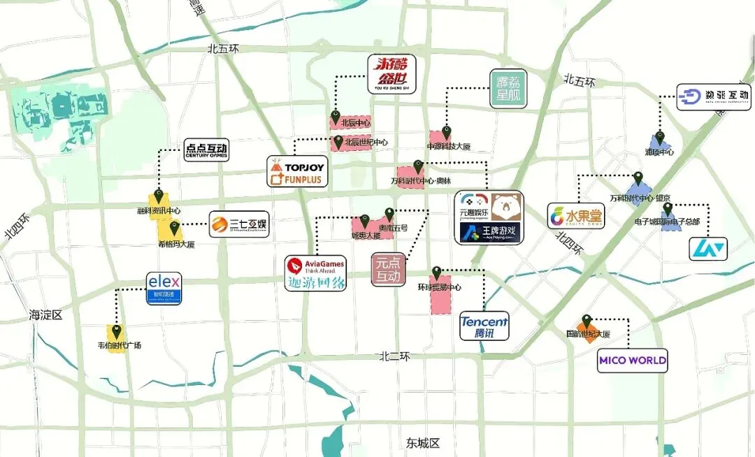 北京的游戏公司并非均匀分布,而是呈现出强烈的集群效应,主要集中在中关村、亚奥、望京几个核心商圈,形成了独特的产业生态。